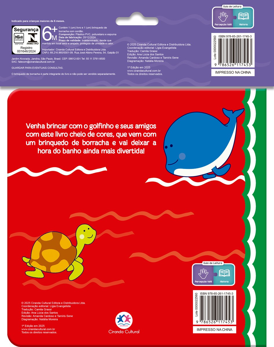 Venha brincar com o golfinho e seus amigos neste livro cheio de cores, que vem com um brinquedo de borracha e vai deixar a hora do banho ainda mais divertida! Acompanhe o golfinho brincalhão em suas aventuras no oceano! Com páginas à prova d’água e um brinquedo de borracha flutuante, este livro convida os bebês a descobrirem novas formas e cores enquanto se divertem no banho.