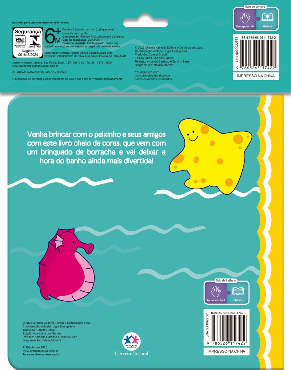 Mergulhe com o peixinho colorido e descubra o fundo do mar de um jeito cheio de alegria! Este livro de banho acompanha um brinquedo de borracha e traz ilustrações vibrantes que encantam e despertam a curiosidade dos pequenos.