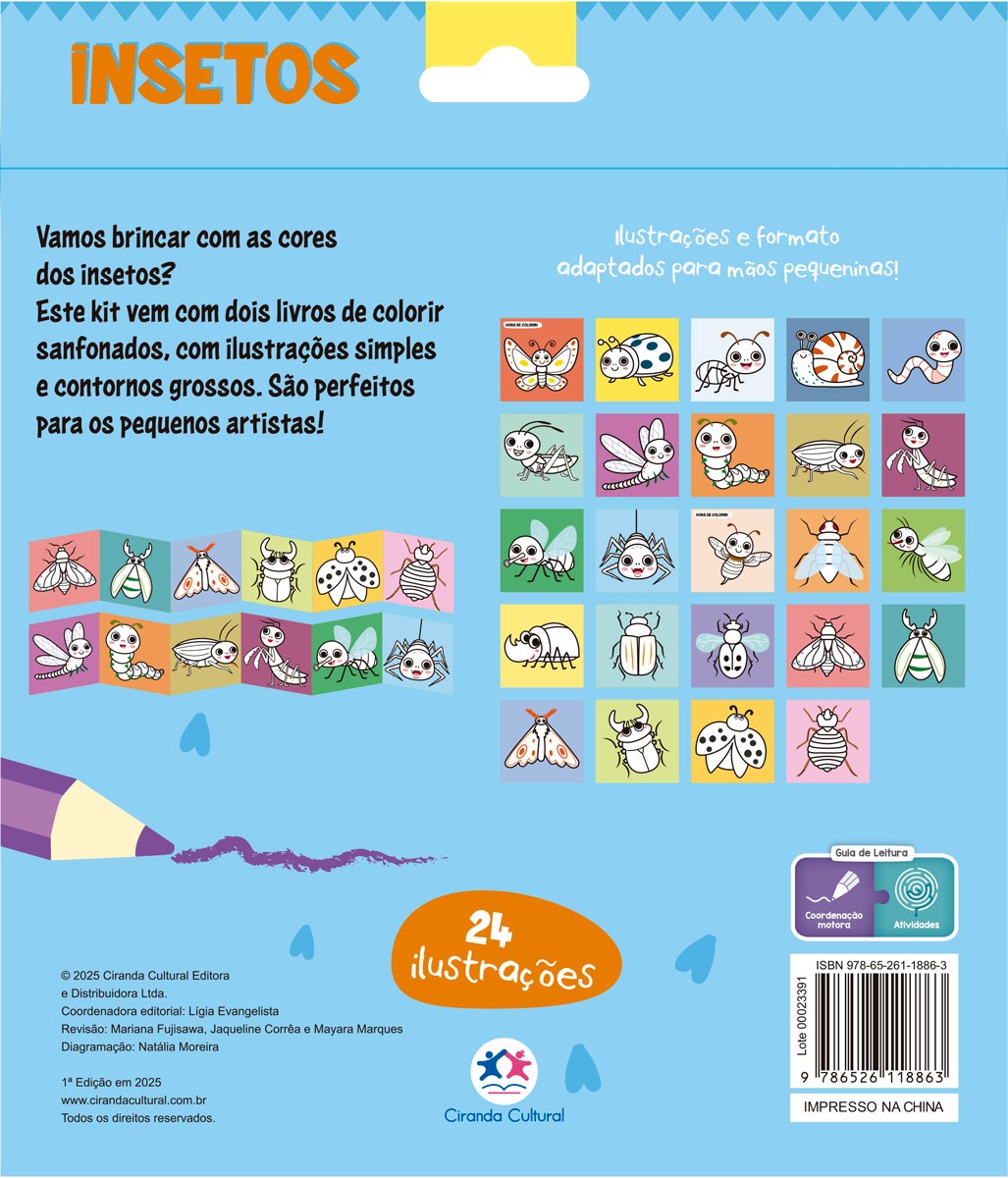 Este kit vem com dois livros de colorir sanfonados, com ilustrações simples e contornos grossos, ideais para facilitar a pintura e estimular a criatividade das crianças. Joaninhas, borboletas, abelhinhas e outros insetos simpáticos convidam os pequenos artistas a explorar cores e formas da natureza, enquanto desenvolvem a coordenação motora e a imaginação.