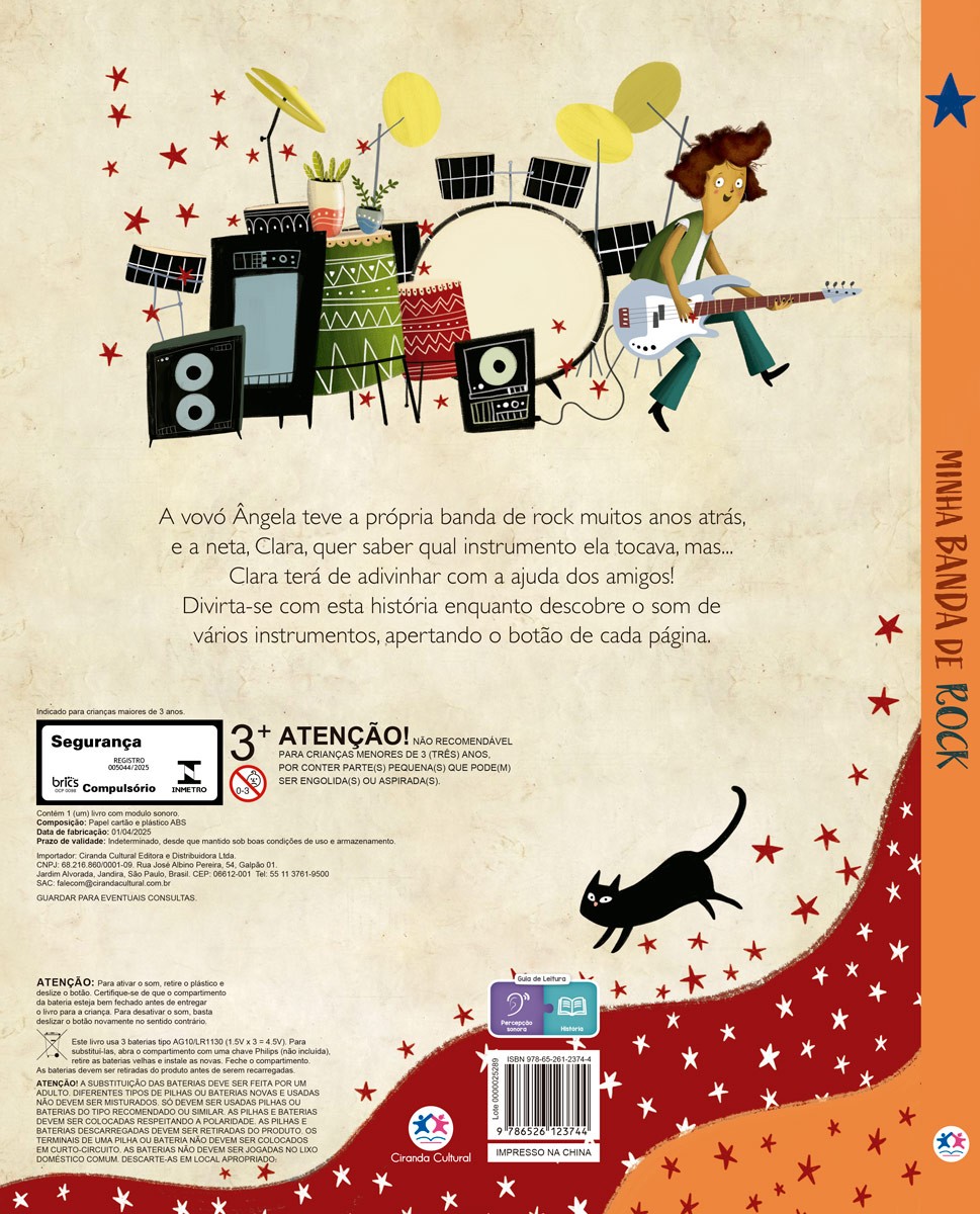 Com muito humor, música e surpresas, este livro convida as crianças a mergulharem no universo do rock de forma interativa e divertida. A cada página, a curiosidade aumenta, estimulando a escuta atenta, a imaginação e o reconhecimento dos sons, enquanto a leitura se transforma em uma experiência musical cheia de energia.