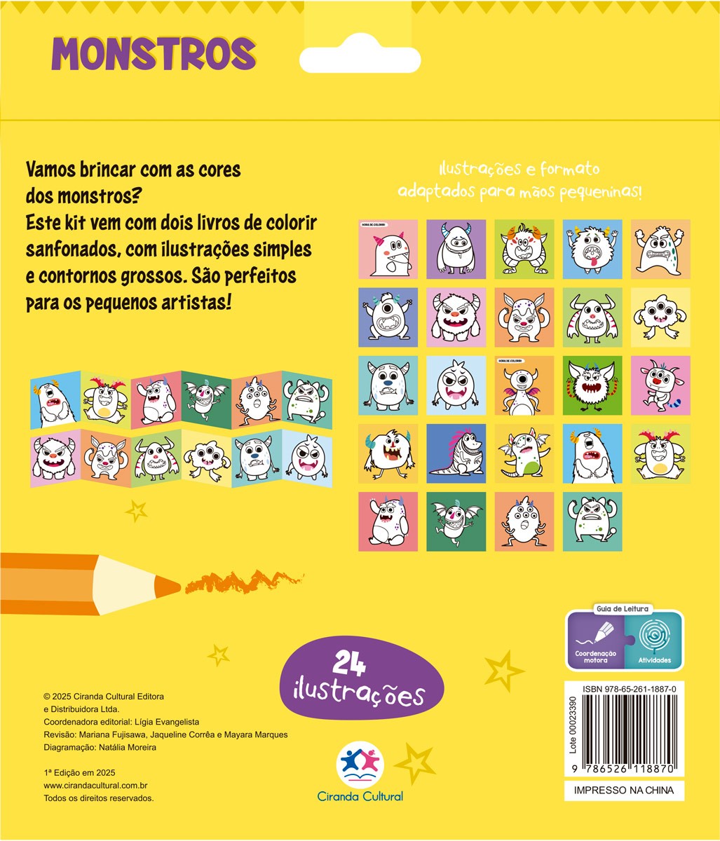 Este kit vem com dois livros de colorir sanfonados, com ilustrações simples e contornos grossos, ideais para facilitar a pintura e estimular a criatividade das crianças. Monstrinhos divertidos e cheios de personalidade convidam os pequenos artistas a soltar a imaginação, enquanto desenvolvem a coordenação motora e se divertem sem medo.