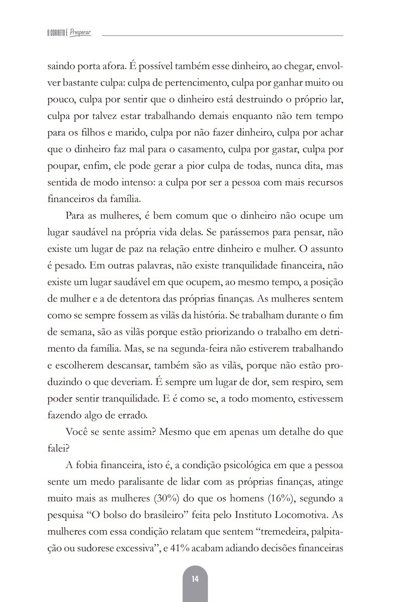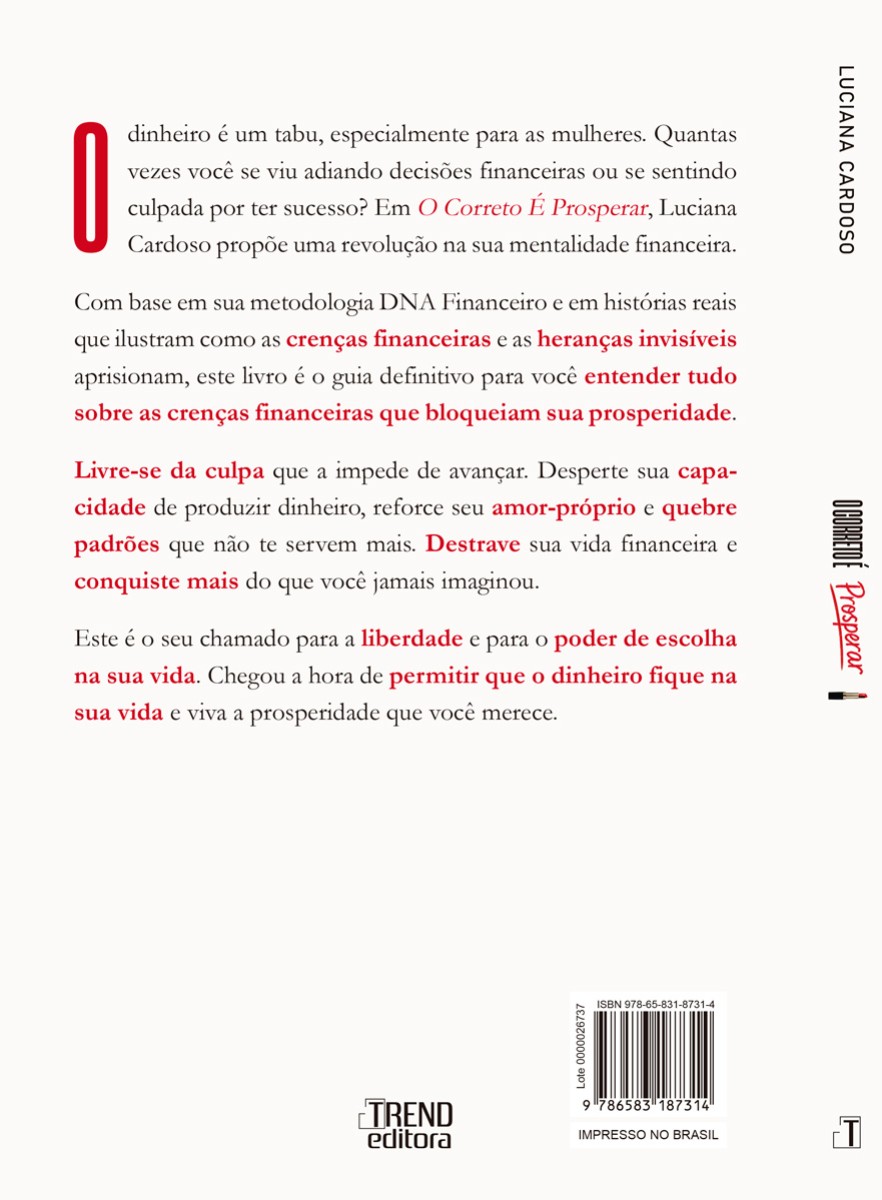 O dinheiro é um tabu, especialmente para as mulheres. Quantas vezes você se viu adiando decisões financeiras ou se sentindo culpada por ter sucesso? Em O Correto É Prosperar, Luciana Cardoso propõe uma revolução na sua mentalidade financeira. Com base em sua metodologia DNA Financeiro e em histórias reais que ilustram como as crenças financeiras e as heranças invisíveis aprisionam, este livro é o guia definitivo para você entender tudo sobre as crenças financeiras que bloqueiam sua prosperidade. Livre-se da culpa que a impede de avançar. Desperte sua capacidade de produzir dinheiro, reforce seu amor-próprio e quebre padrões que não te servem mais. Destrave sua vida financeira e conquiste mais do que você jamais imaginou. Este é o seu chamado para a liberdade e para o poder de escolha na sua vida. Chegou a hora de permitir que o dinheiro fique na sua vida e viva a prosperidade que você merece.
