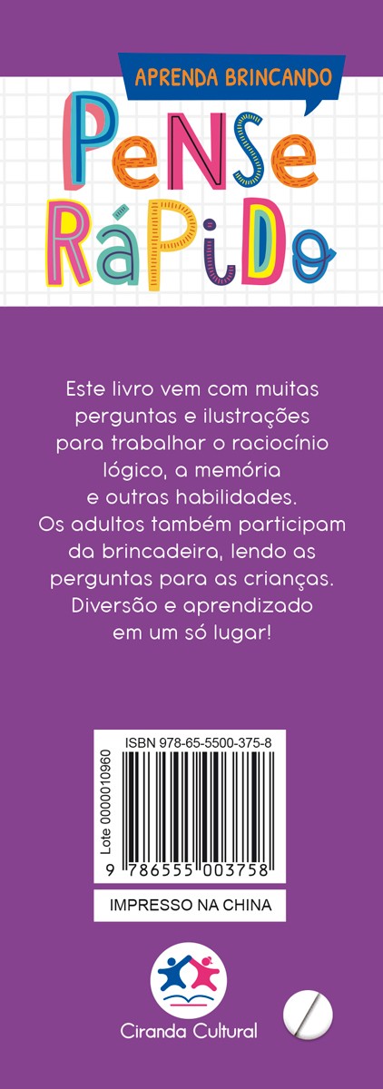 Este livro vem com muitas perguntas e ilustrações para trabalhar o raciocínio lógico, a memória e outras habilidades. Os adultos também participam da brincadeira, lendo as perguntas para as crianças. Diversão e aprendizado em um só lugar!