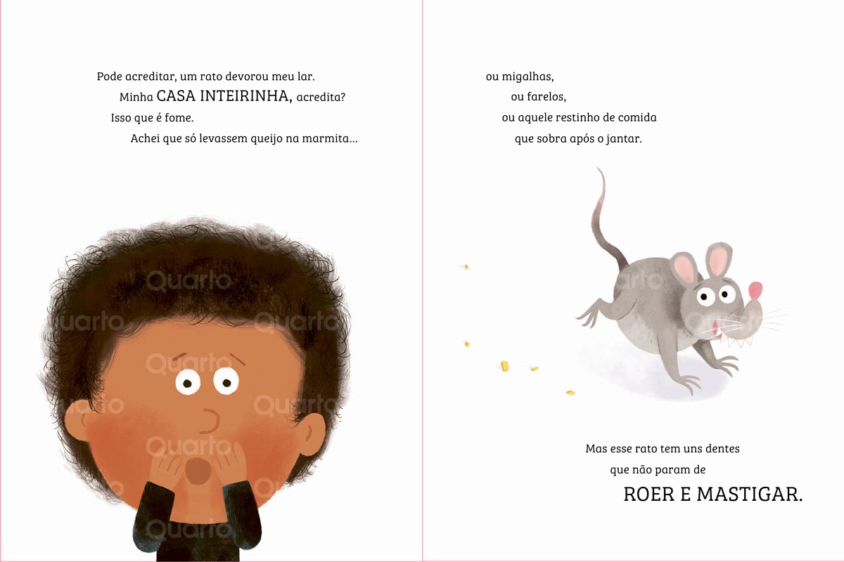 Ah, não! Um ratinho guloso está DEVORANDO A MINHA CASA! Ele já ROEU até este livro! Mas o que será que esse ratinho está procurando? Por que está com tanta FOME? Cada pedaço da casa, cada objeto e até o próprio livro estão sendo devorados por esse ratinho travesso e cheio de apetite! A confusão só aumenta a cada página, e o leitor é desafiado a descobrir: será que algum dia ele vai PARAR???