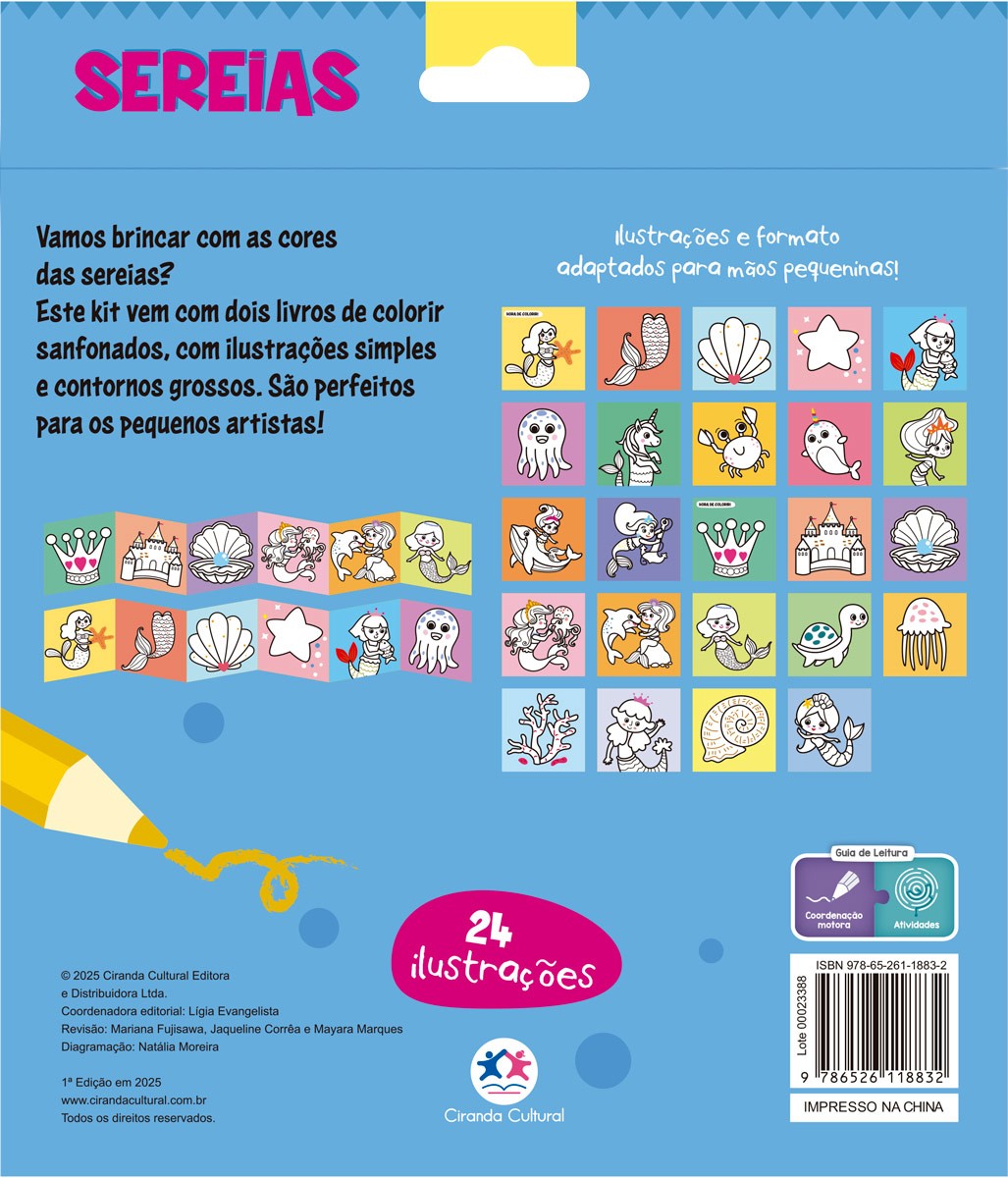 Este kit vem com dois livros de colorir sanfonados, com ilustrações simples e contornos grossos, ideais para facilitar a pintura e estimular a criatividade das crianças. Sereias encantadoras e elementos do fundo do mar convidam os pequenos artistas a mergulhar em um universo cheio de fantasia, enquanto desenvolvem a coordenação motora e a imaginação.