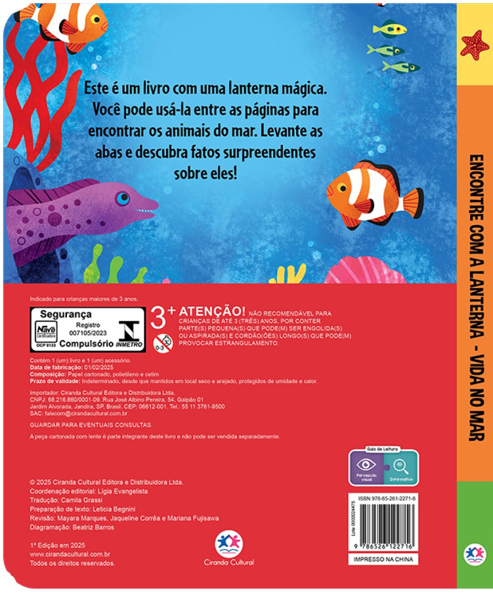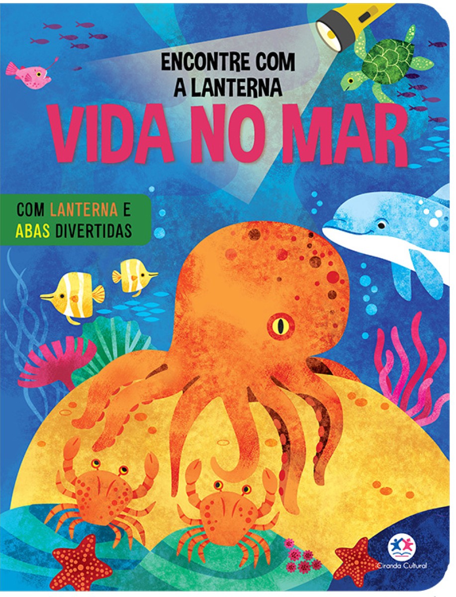 Este é um livro com uma lanterna mágica. Você pode usá-la entre as páginas para encontrar os animais do mar. Levante as abas e descubra fatos surpreendentes