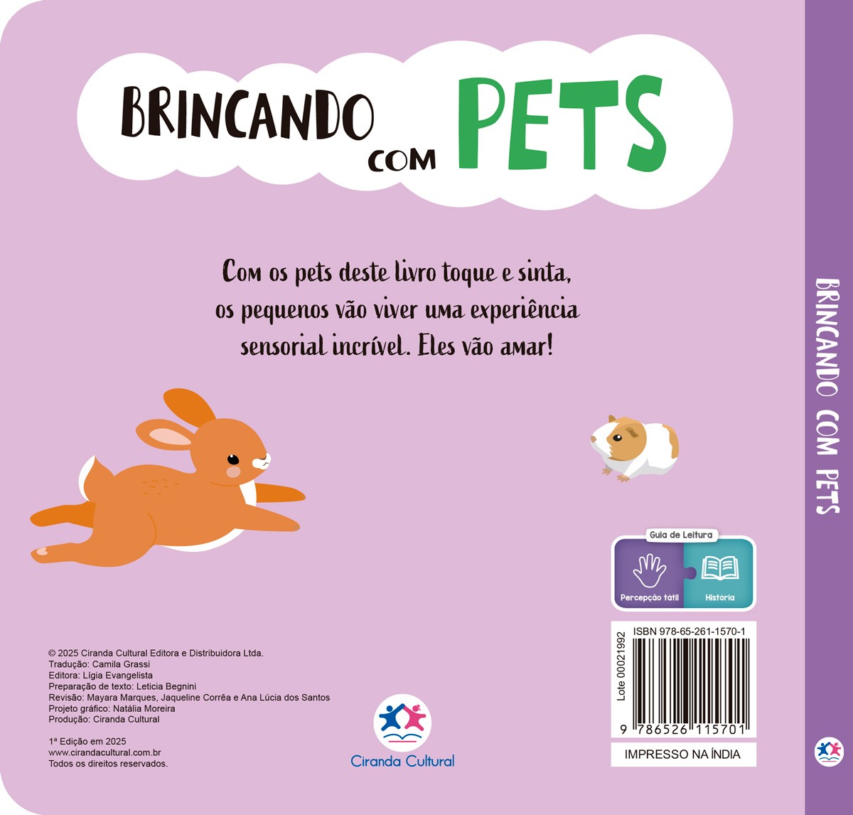 Com o livro sensorial Brincando com Pets, as crianças vão adorar tocar na barriguinha dos seus animais favoritos! Desde o pelo fofinho do cachorro até a suavidade da barriga do gatinho, cada página oferece uma textura sensorial para que os pequenos se conectem com seus amigos de quatro patas. Ao explorar essas barriguinhas, as crianças aprendem sobre o cuidado e o carinho que devemos ter com nossos pets, enquanto desenvolvem suas habilidades sensoriais e emocionais.