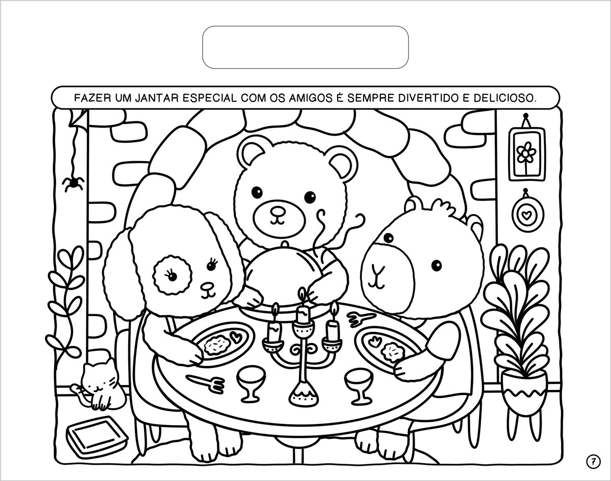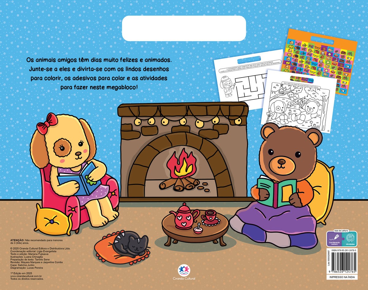 Os animais amigos têm dias muito felizes e animados. Junte-se a eles e divirta-se com os lindos desenhos para colorir, os adesivos para colar e as atividades para fazer neste megabloco!