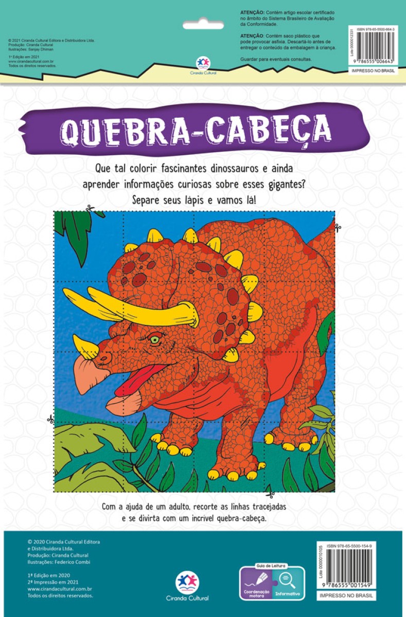 Que tal colorir fascinantes dinossauros com suas cores favoritas e ainda aprender informações curiosas sobre esses gigantes? Separe seus lápis e vamos lá! Kit composto por 9786555001549 - Dinossauros e giz de cera