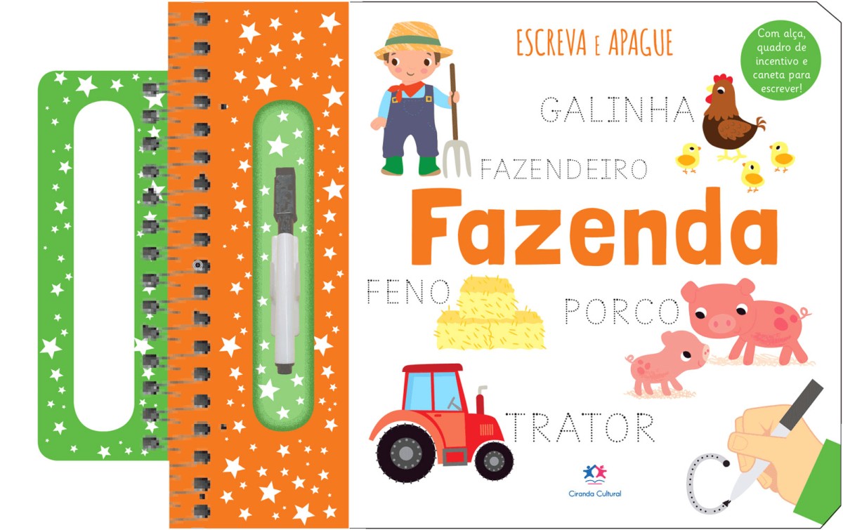 Use sua caneta para contornar os animais e escrever os nomes de cada um. Depois, apague e faça tudo de novo, quantas vezes quiser! E você ainda pode carregar seu livro por toda parte, segurando-o pela alça!