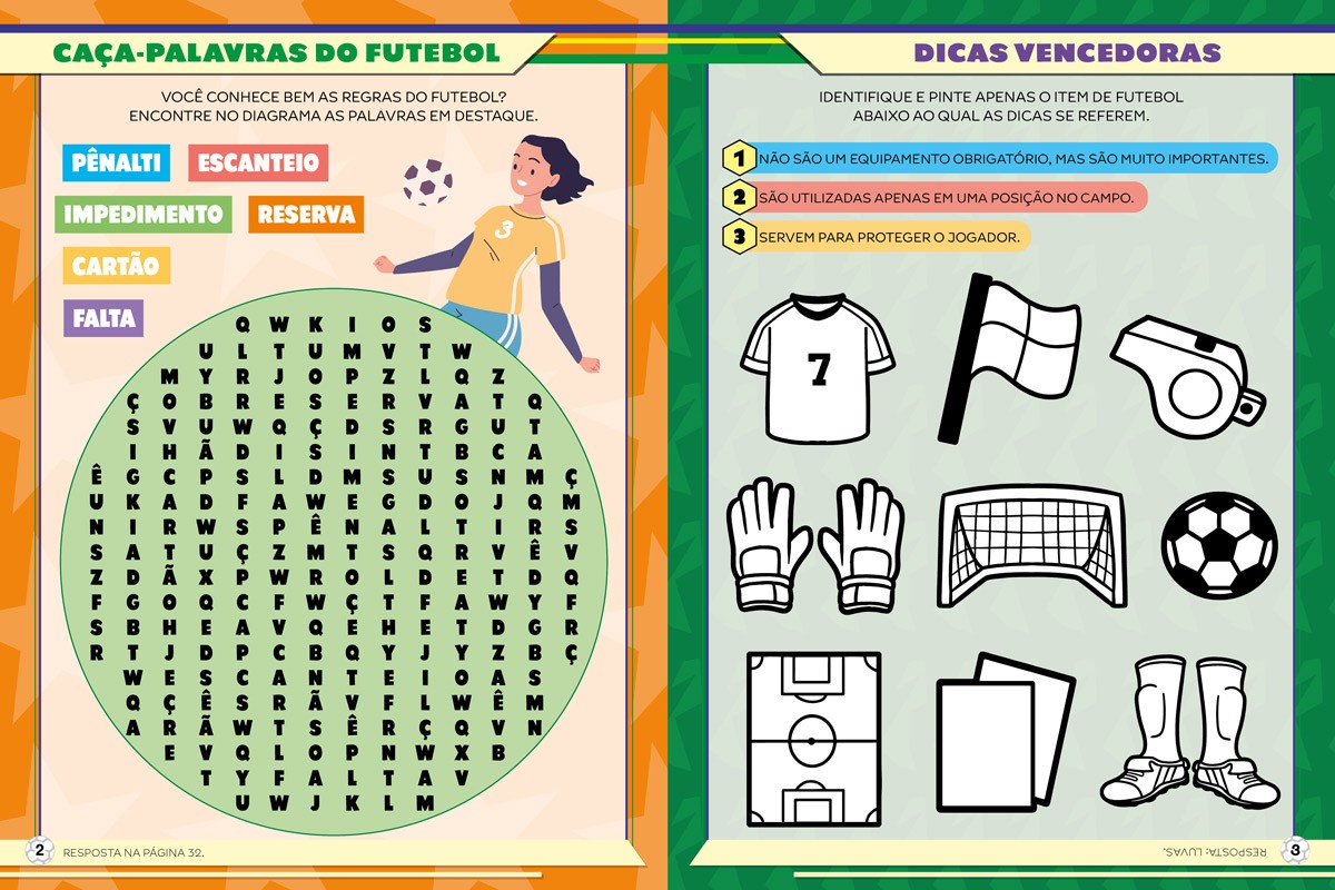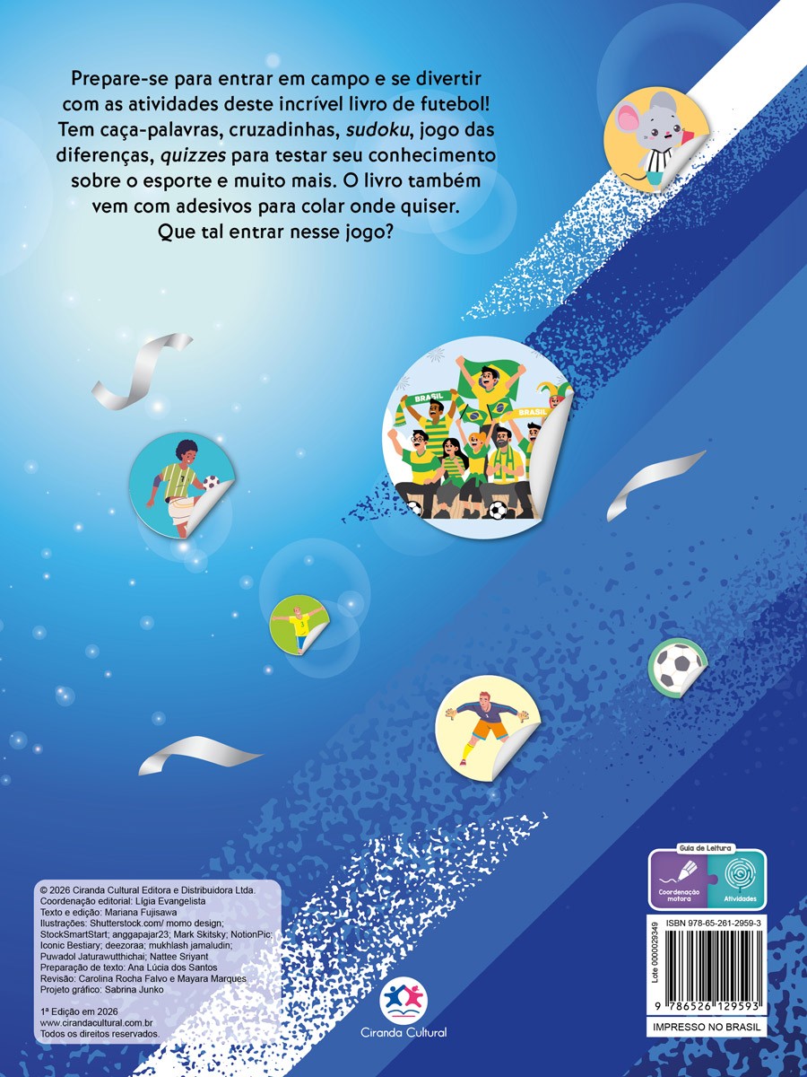 Prepare-se para entrar em campo e se divertir com as atividades deste incrível livro de futebol! Tem caça-palavras, cruzadinhas, sudoku, jogo das diferenças, quizzes para testar seu conhecimento sobre o esporte e muito mais. O livro também vem com adesivos para colar onde quiser. Que tal entrar nesse jogo?