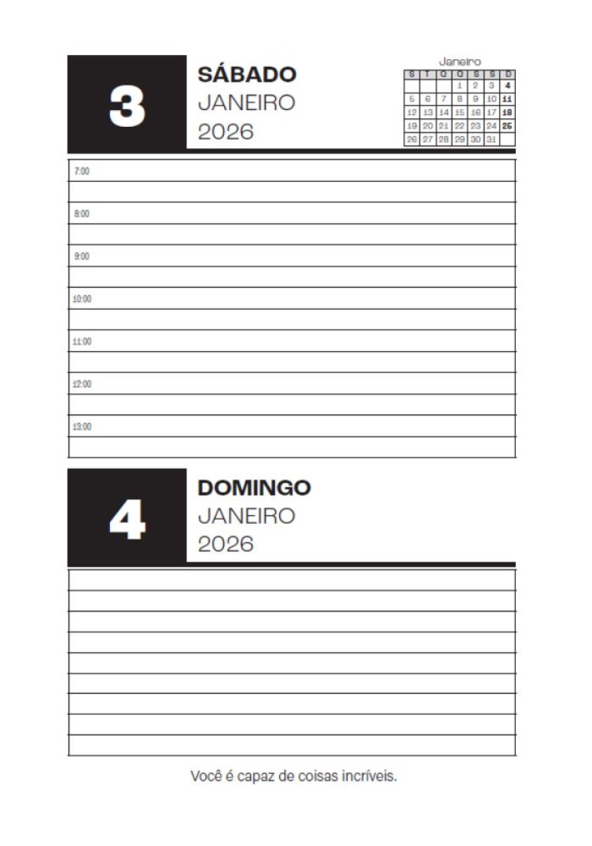 Transforme seus dias com a Agenda Diária 2026 – Sua aliada na produtividade! Organize-se com estilo e eficiência com esta agenda no tamanho ideal (15,5 x 12 cm), feita sob medida para acompanhar sua rotina com praticidade e elegância. 320 páginas premium datadas para 2026 – planeje cada dia com clareza, sem perder nenhum compromisso! Frases motivacionais diárias – comece cada manhã com inspiração e foco total. Capa dura super resistente e encadernação espiral – durabilidade garantida para o uso diário, sem perder a sofisticação.Perfeita para quem quer mais produtividade, organização e leveza no dia a dia. Estoque limitado – garanta agora a sua e comece 2026 com o pé direito!