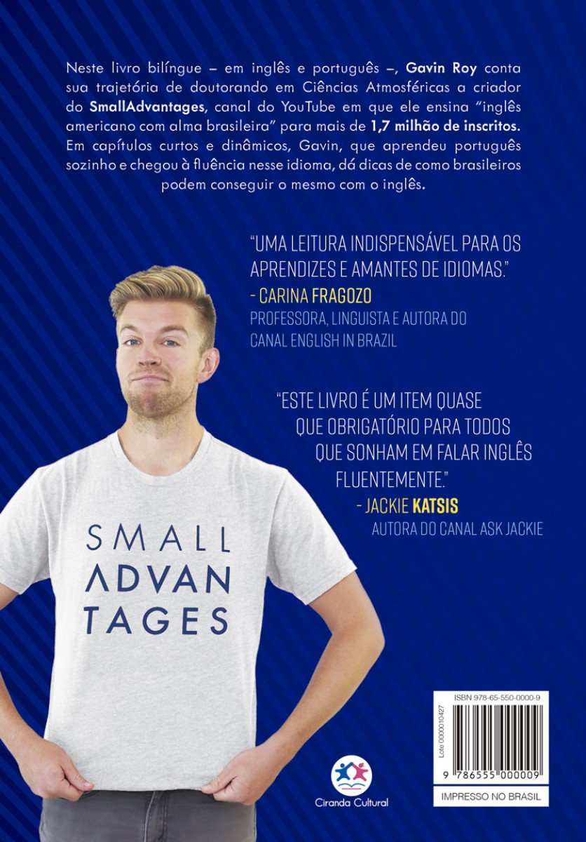 Neste livro bilíngue em inglês e português , Gavin Roy conta sua trajetória de doutorando em Ciências Atmosféricas a criador do SmallAdvantages, canal do YouTube em que ele ensina inglês americano com alma brasileira para mais de 1,7 milhão de inscritos. Em capítulos curtos e dinâmicos, Gavin, que aprendeu português sozinho e chegou à fluência nesse idioma, dá dicas de como brasileiros podem conseguir o mesmo com o inglês.