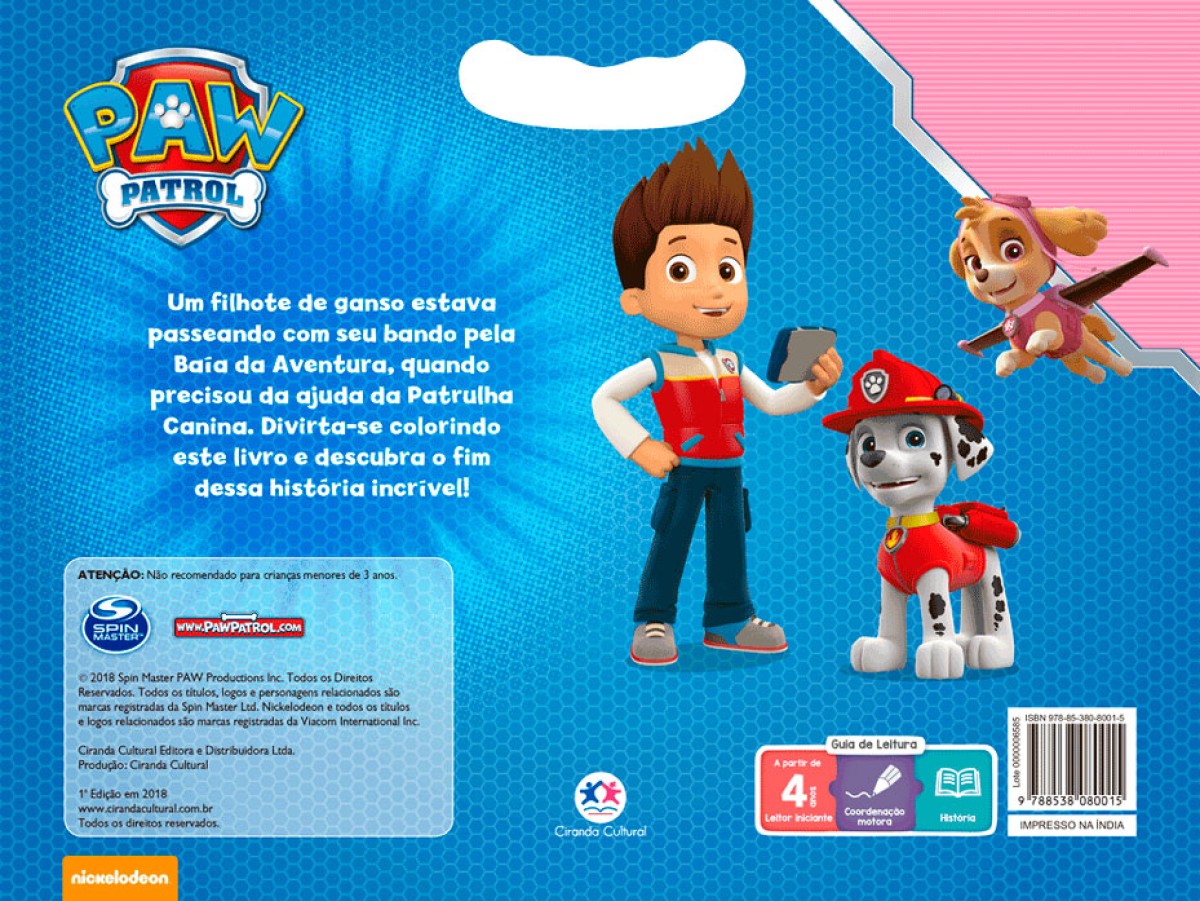 Um filhote de ganso estava passeando com seu bando pela Baía da Aventura, quando precisou da ajuda da Patrulha Canina. Divirta-se colorindo este livro e descubra o fim dessa história incrível!