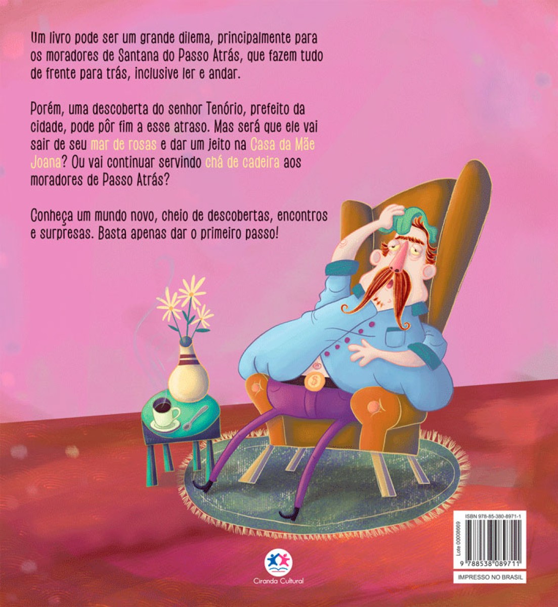 Um livro pode ser um grande dilema, principalmente para os moradores de Santana do Passo Atrás, que fazem tudo de frente para trás, inclusive ler e andar. Porém, uma descoberta do senhor Tenório, prefeito da cidade, pode pôr fim a esse atraso. Mas será que ele vai sair de seu mar de rosas e dar um jeito na Casa da Mãe Joana? Ou vai continuar servindo chá de cadeira aos moradores de Passo Atrás? Conheça um mundo novo, cheio de descobertas, encontros e surpresas. Basta apenas dar o primeiro passo!
