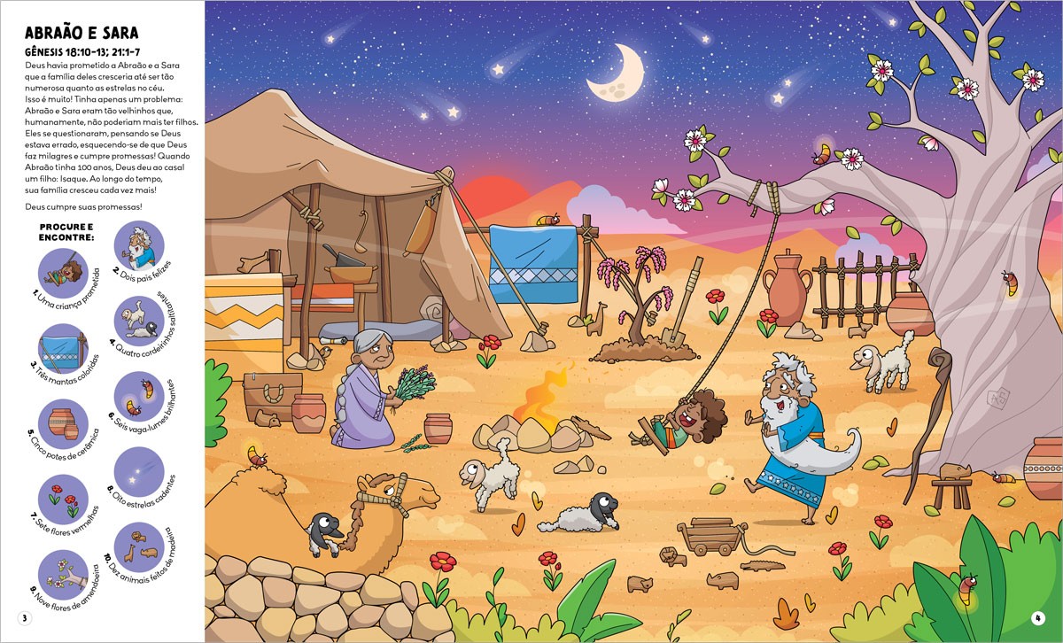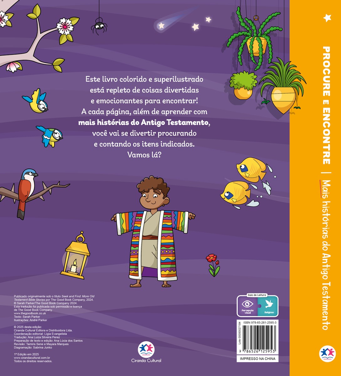 Este livro colorido e superilustrado está repleto de coisas divertidas e emocionantes para encontrar! A cada página, as crianças são convidadas a conhecer mais histórias do Antigo Testamento, explorando cenas ricas em detalhes enquanto procuram e contam os itens indicados. Com desafios visuais envolventes e mais de 450 elementos para encontrar, a leitura se transforma em uma experiência interativa que estimula a atenção, a concentração e o aprendizado de forma divertida. Preparado para observar, procurar e se encantar? Vamos lá!