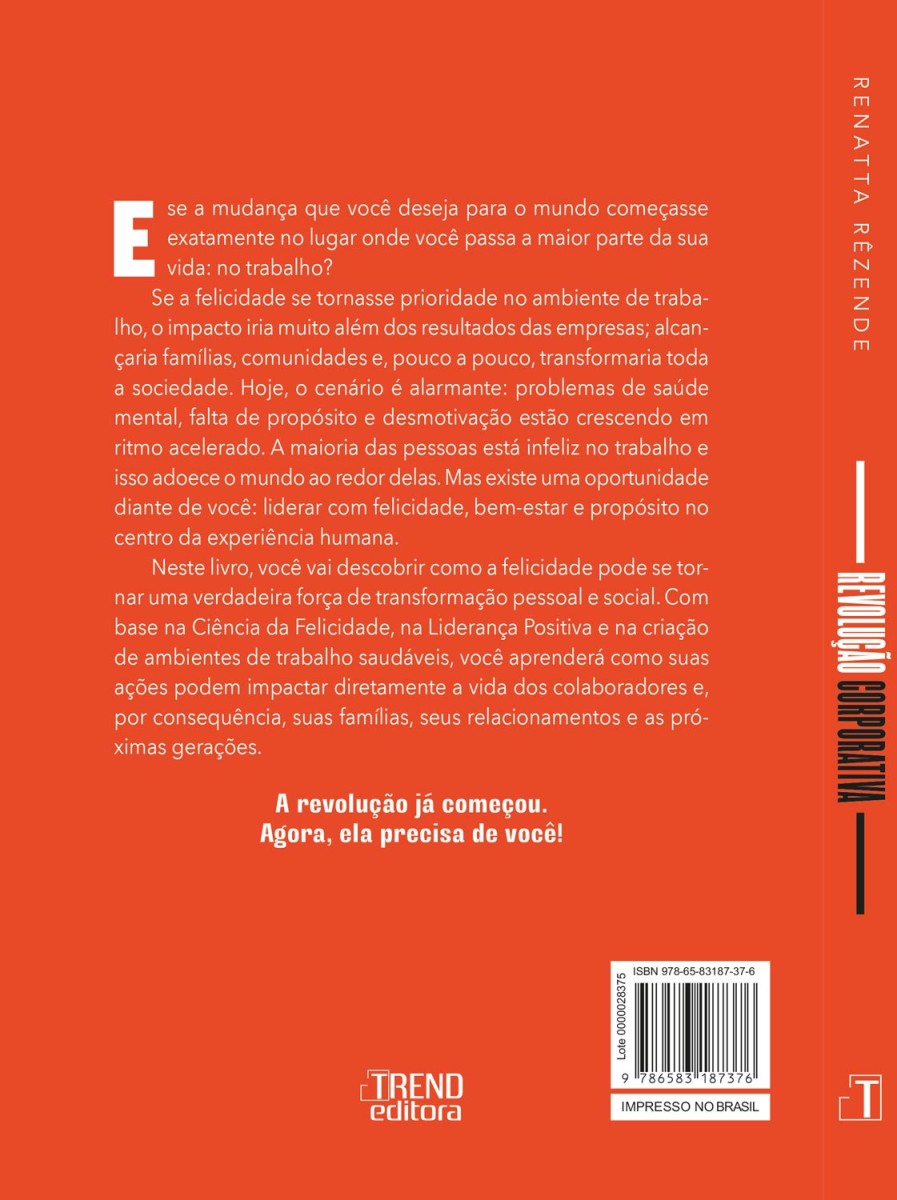 Neste livro, você vai descobrir como a felicidade pode se tornar uma verdadeira força de transformação pessoal e social. Com base na Ciência da Felicidade, na Liderança Positiva e na criação de ambientes de trabalho saudáveis, você aprenderá como suas ações podem impactar diretamente a vida dos colaboradores e, por consequência, suas famílias, seus relacionamentos e as próximas gerações.