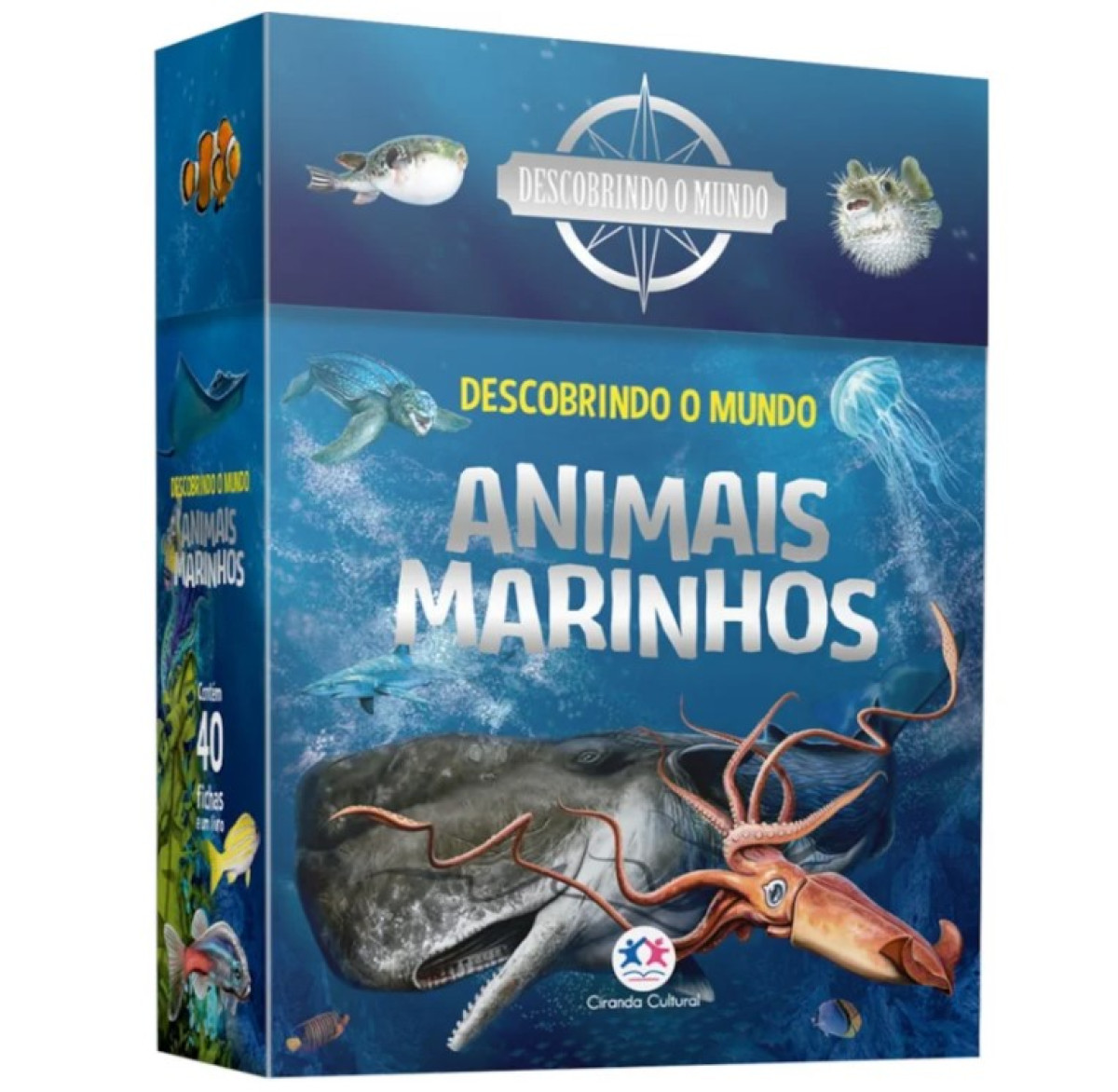 Descubra mais sobre os animais marinhos com esta caixa que contém um livro que apresenta muitas características e curiosidades sobre a fauna que habita os mares e seu entorno, além de 40 fichas ilustradas com uma atividade de perguntas e respostas e um montão de outras informações sobre as espécies de seres marinhos mais conhecidas.
