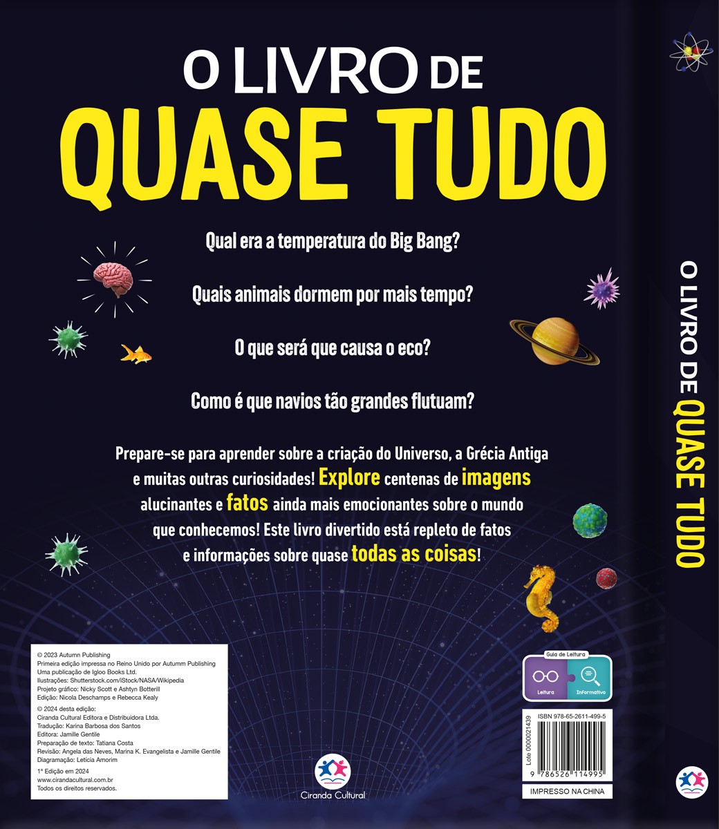 Qual era a temperatura do Big Bang? Quais animais dormem por mais tempo? O que será que causa o eco? Como é que navios tão grandes flutuam? Prepare-se para aprender sobre a criação do Universo, a Grécia Antiga e muitas outras curiosidades! Explore centenas de imagens alucinantes e fatos ainda mais emocionantes sobre o mundo que conhecemos! Este livro divertido está repleto de fatos e informações sobre quase todas as coisas!