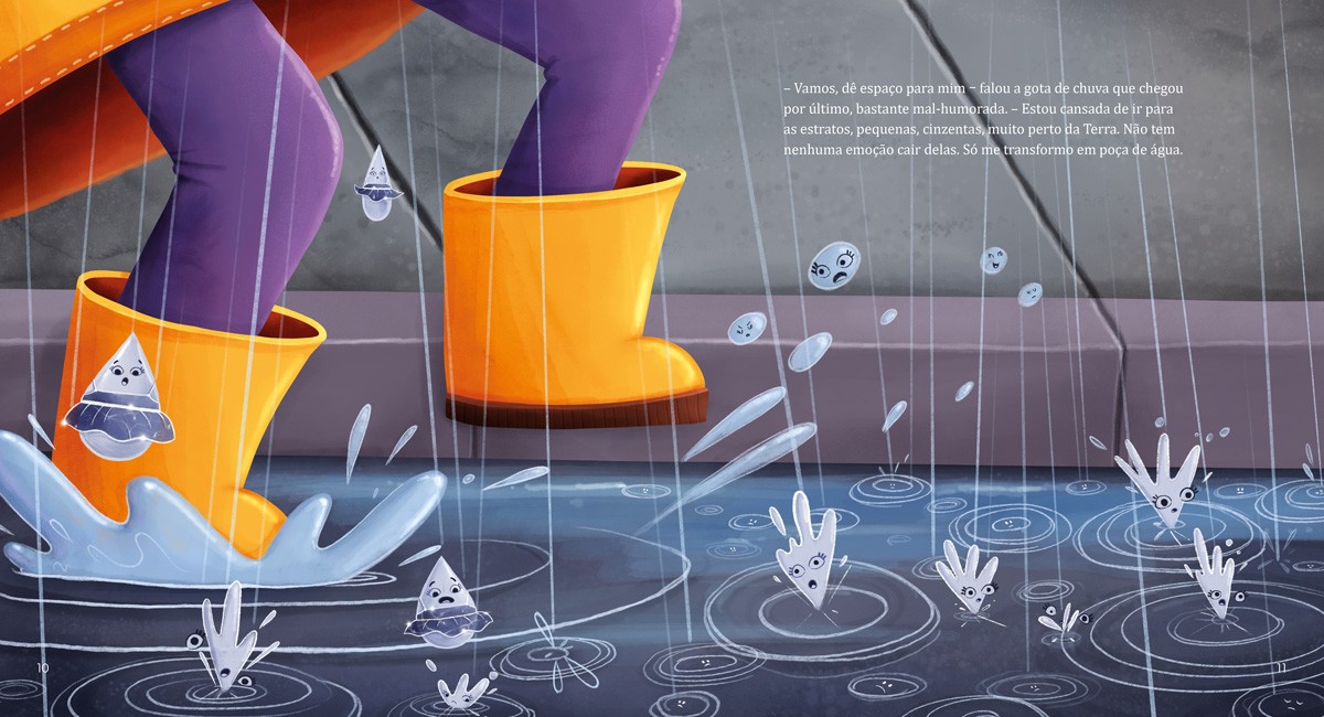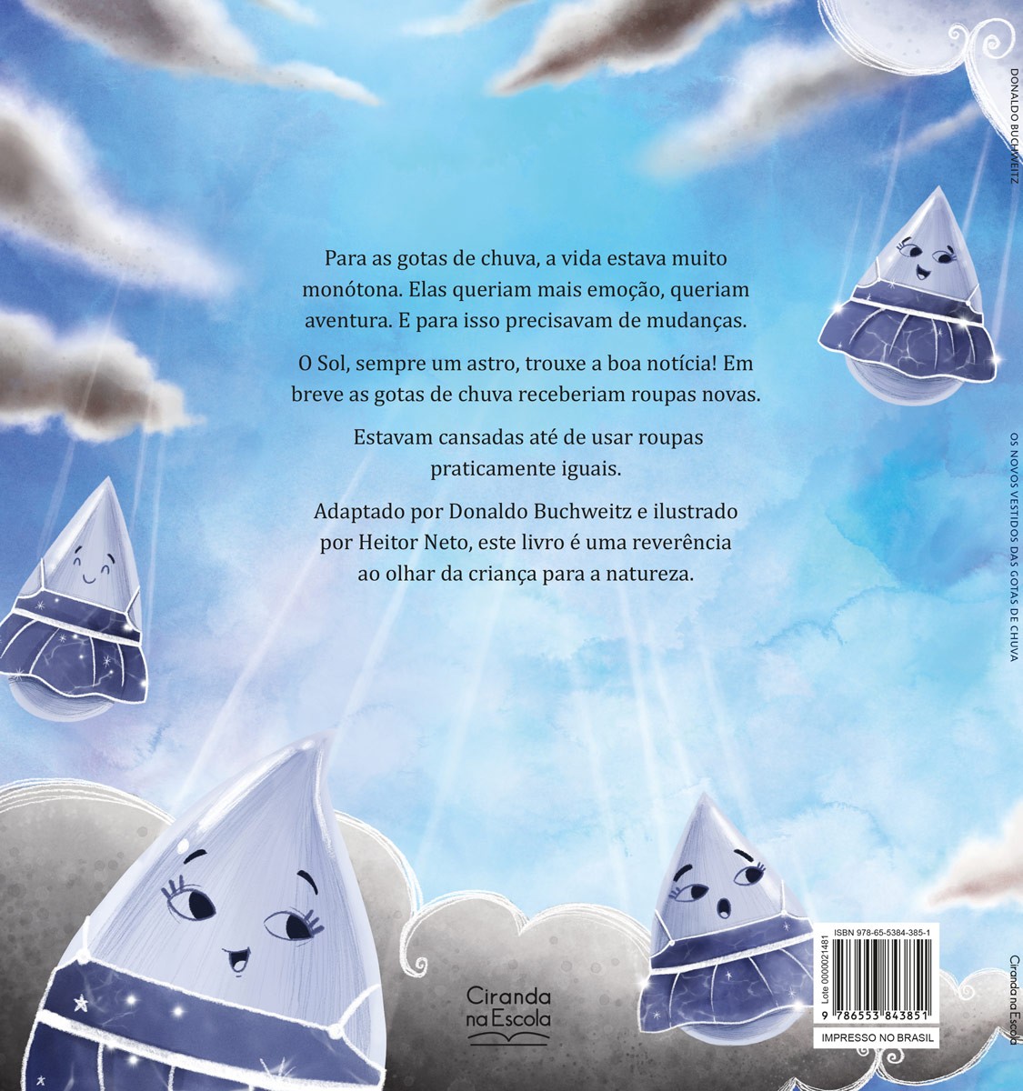 A vida para as gotas de chuva estava muito monótona. Elas queriam mais emoção, queriam aventura. E para isso precisavam de novas roupas. O Sol, sempre um astro, trouxe a boa notícia! Em breve as gotas de chuva receberiam roupas novas. Estavam cansadas até de usar roupas praticamente iguais. Escrito por Donaldo Buchweitz e ilustrado por Heitor Neto, o texto é uma reverência ao olhar da criança para a natureza.