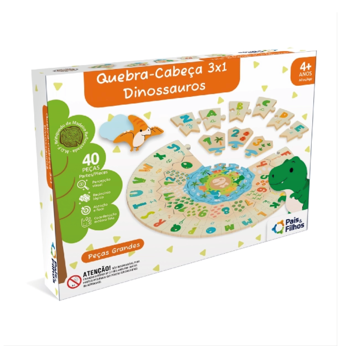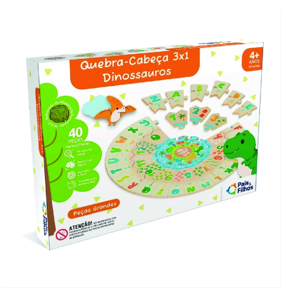 O Quebra-Cabeça 3x1 Dinossauros em madeira oferece três opções em um só jogo. Ele diverte e ensina, incentivando a concentração e a coordenação motora fina.