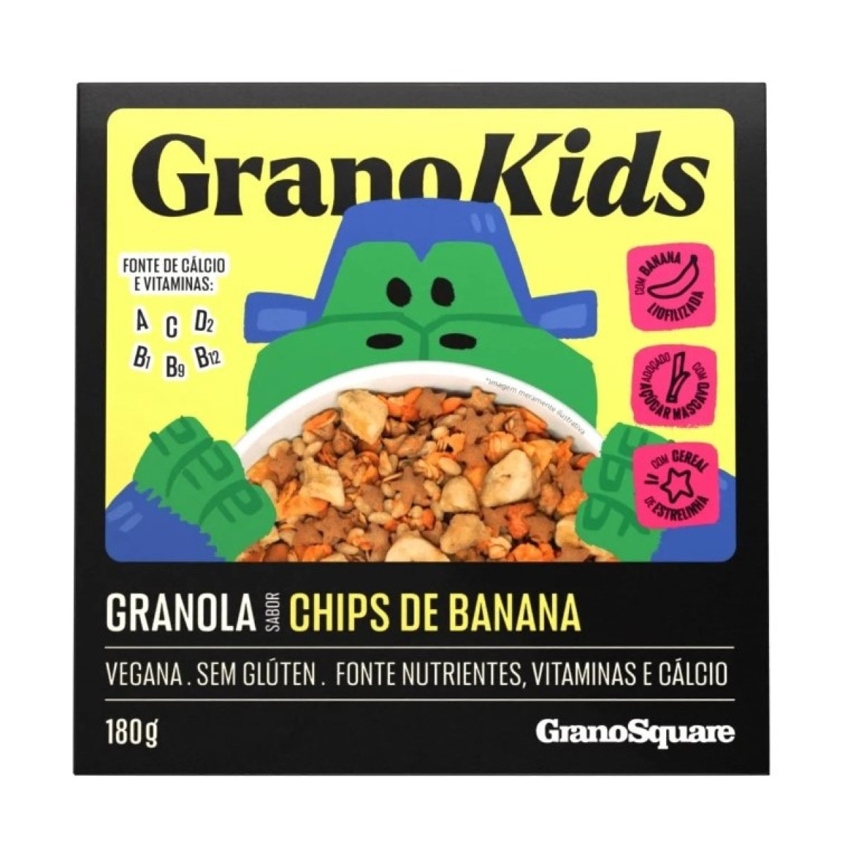 A Granola Chios de Banana da linha Granokids da marca Granosquare é a opção perfeita para um lanche saudável e saboroso. Com embalagem econômica contendo 12 unidades de 180g cada, você terá sempre um snack prático e nutritivo à mão.