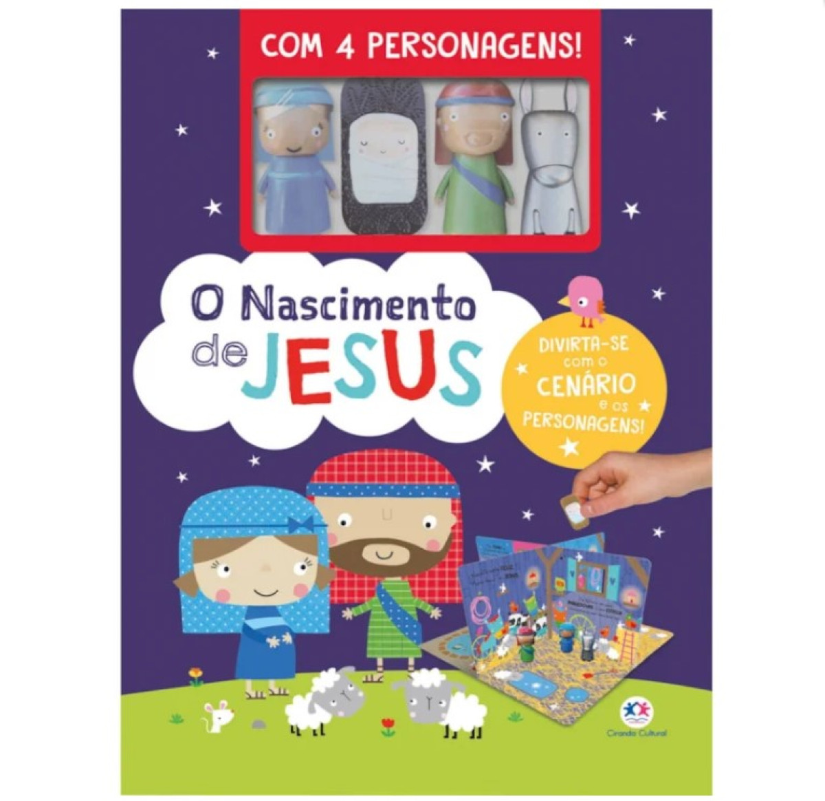 Encante-se com a história do nascimento de Jesus. Leia, monte o cenário e brinque com os quatro personagens.