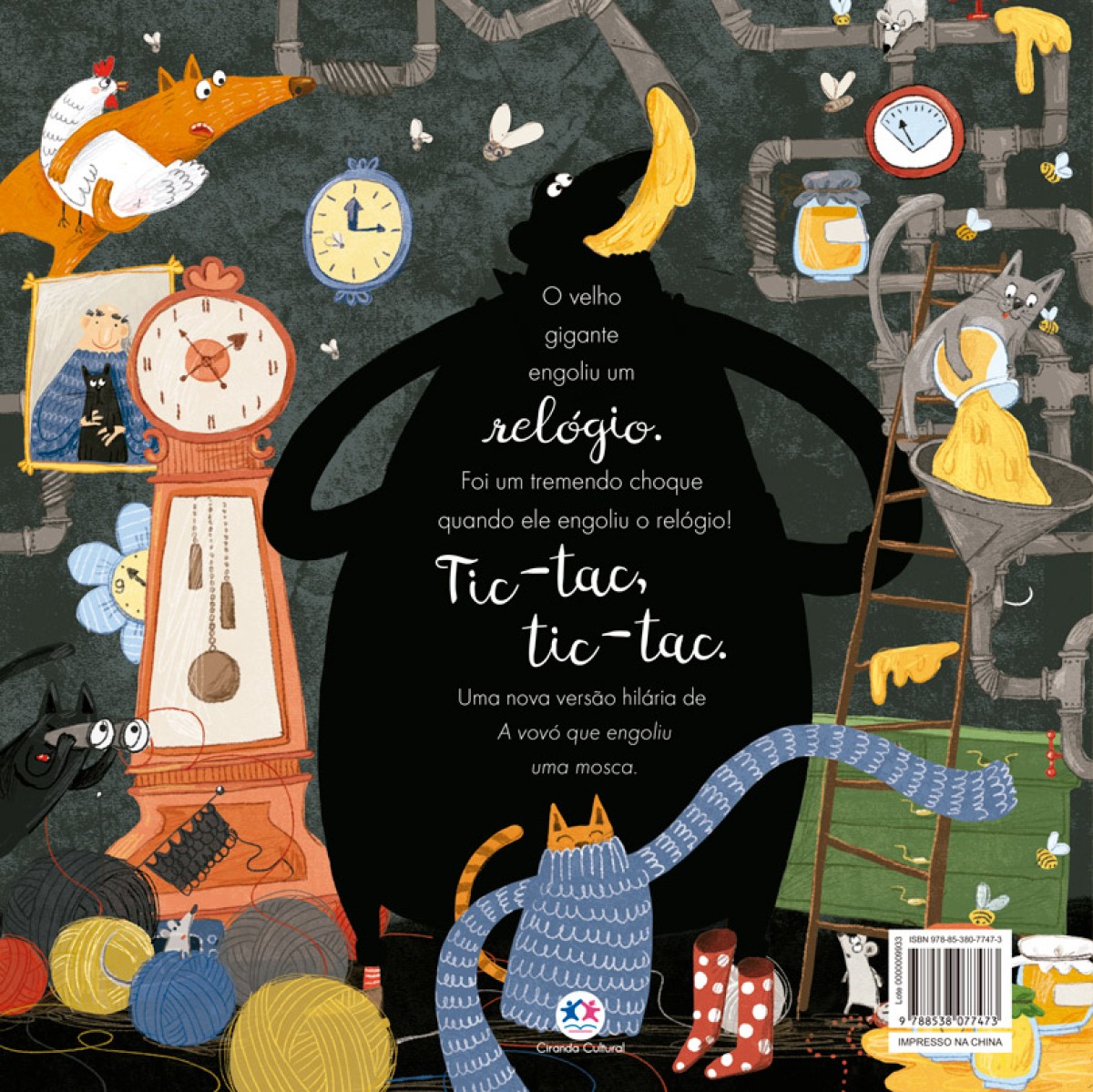 Tinha um velho gigante que engoliu um relógio. Foi um tremendo choque, quando ele engoliu o relógio! Tic-tac, tic-tac. Uma nova versão hilária de Tinha uma velhinha que engoliu uma mosca.