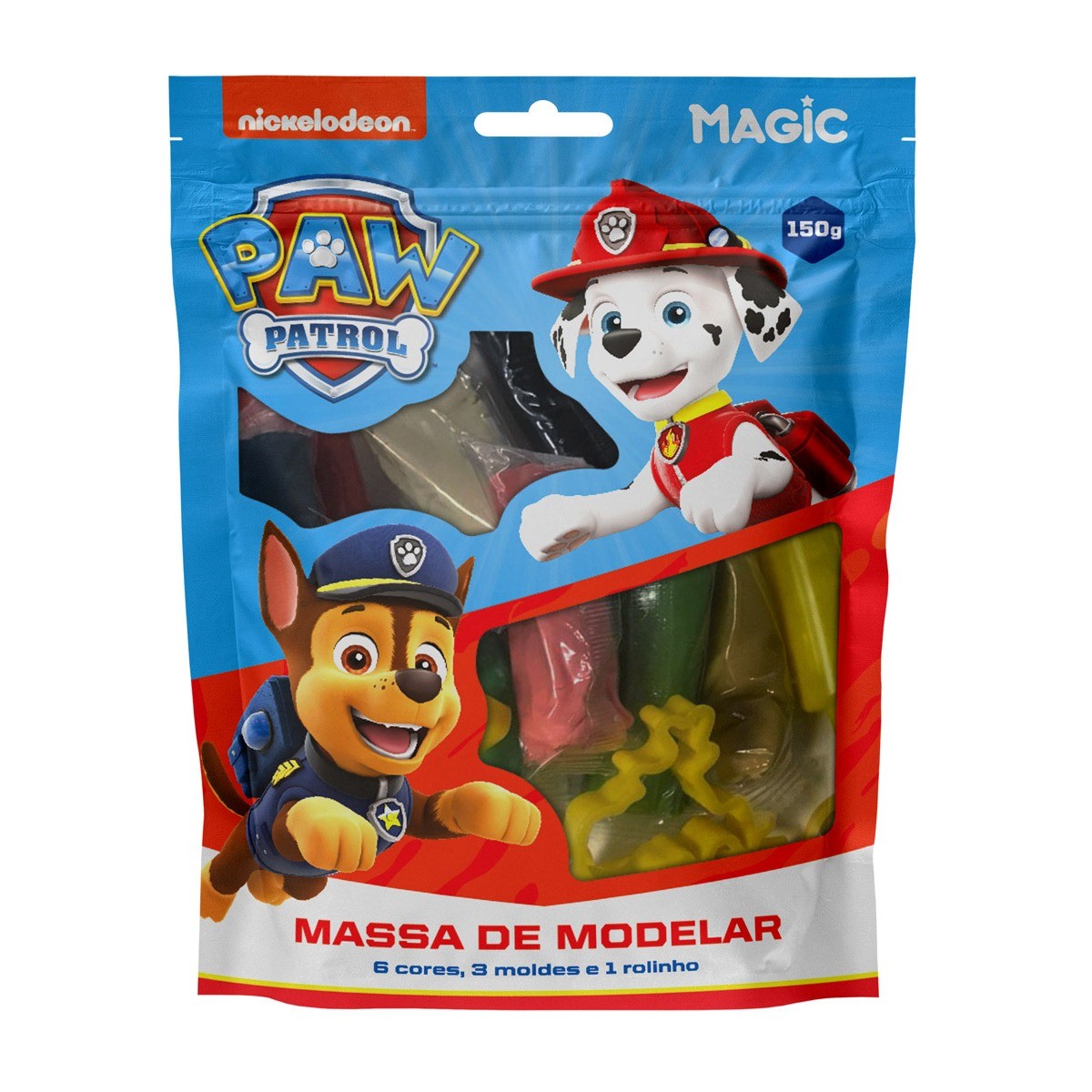 Massa modelar 6 cores 3 moldes 1 rolinho - Patrulha Canina Meninos é uma ótima opção para crianças criarem e brincarem com os personagens da Patrulha Canina. Ideal para lojistas que buscam produtos educativos e atrativos.