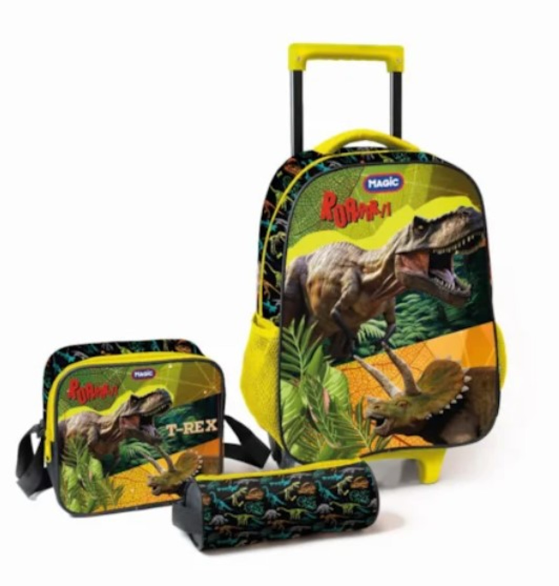 Mochila de rodinhas com estojo e lancheira - Dinossauro T-REX traz o tema do poderoso T-REX, ideal para crianças apaixonadas por dinossauros. Completa e prática, é excelente para lojistas que buscam produtos atrativos.