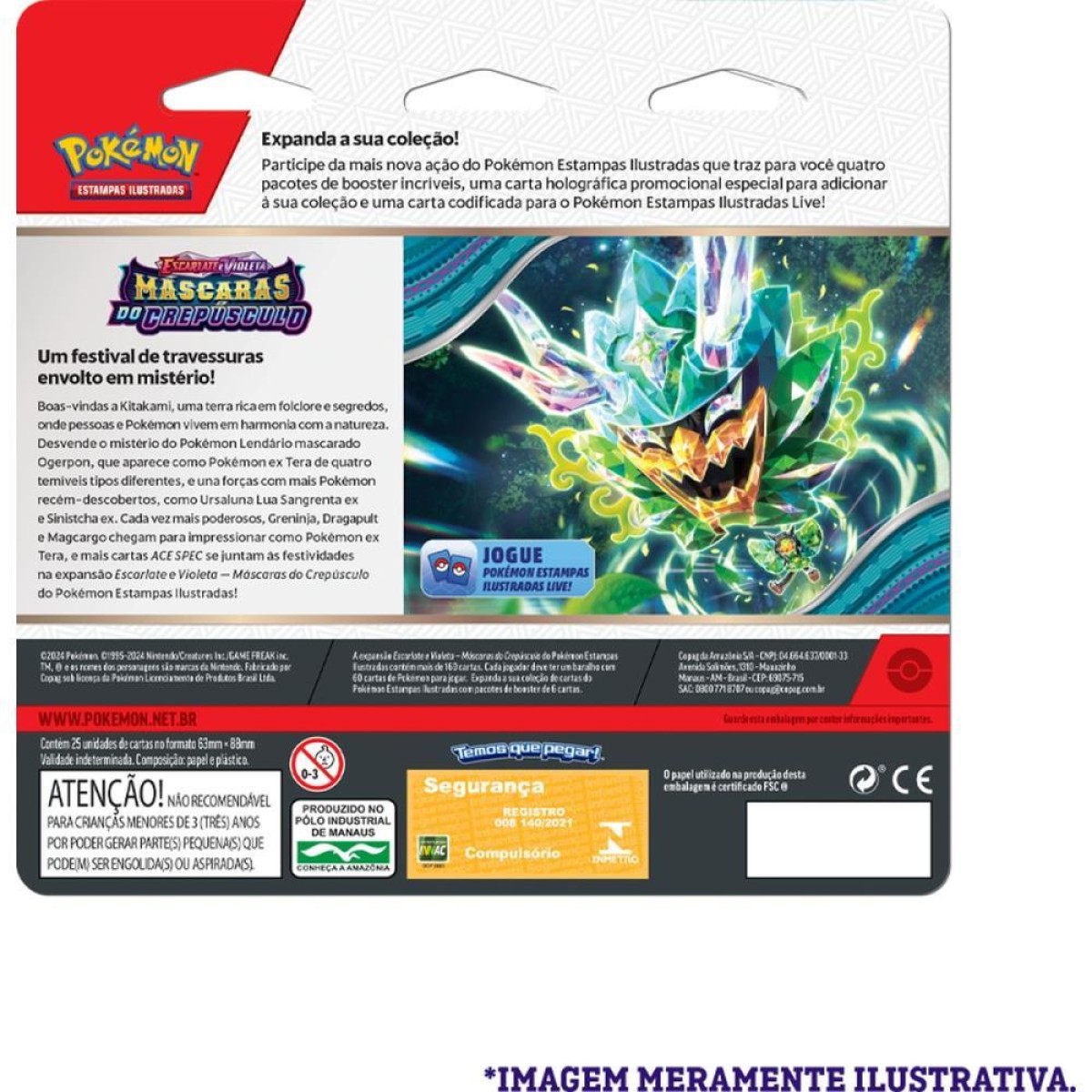 Desvende o misterio do Pokemon Lendario mascarado Ogerpon, que aparece como Pokemon ex Tera de quatro temiveis tipos diferentes, e una forcas com mais Pokemon recem-descobertos, como Ursaluna Lua Sangrenta ex e Sinistcha ex. Cada vez mais poderosos, Greninja, Dragapult e Magcargo chegam para impressionar como Pokemon ex Tera, e mais cartas ACE SPEC se juntam as festividades na expansao Escarlate e Violeta — Mascaras do Crepusculo do Pokemon Estampas Ilustradas!