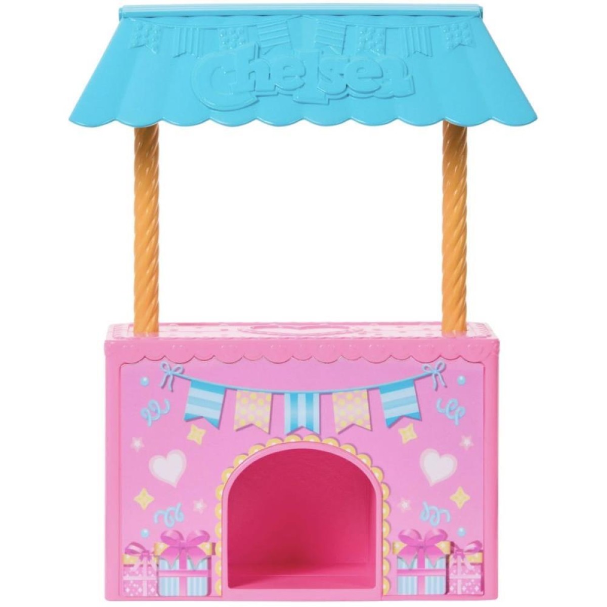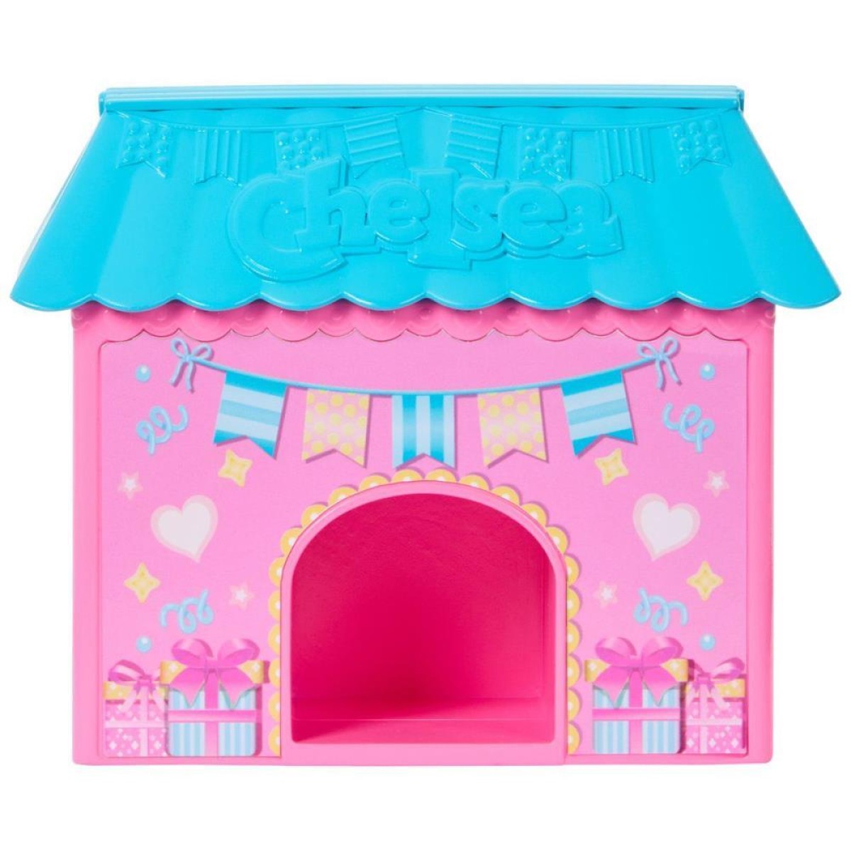 Inclui: 1 pequena boneca Chelsea Barbie com saia removível, 1 casinha de cachorro que se transforma em mesa de festa, 1 cachorrinho de estimação, 2 chapéus de festa, 1 bolo, 1 vela, 1 balão em formato de bichinho, 1 pá para servir bolo, 2 presentes, 2 pirulitos e 1 fatia de bolo.