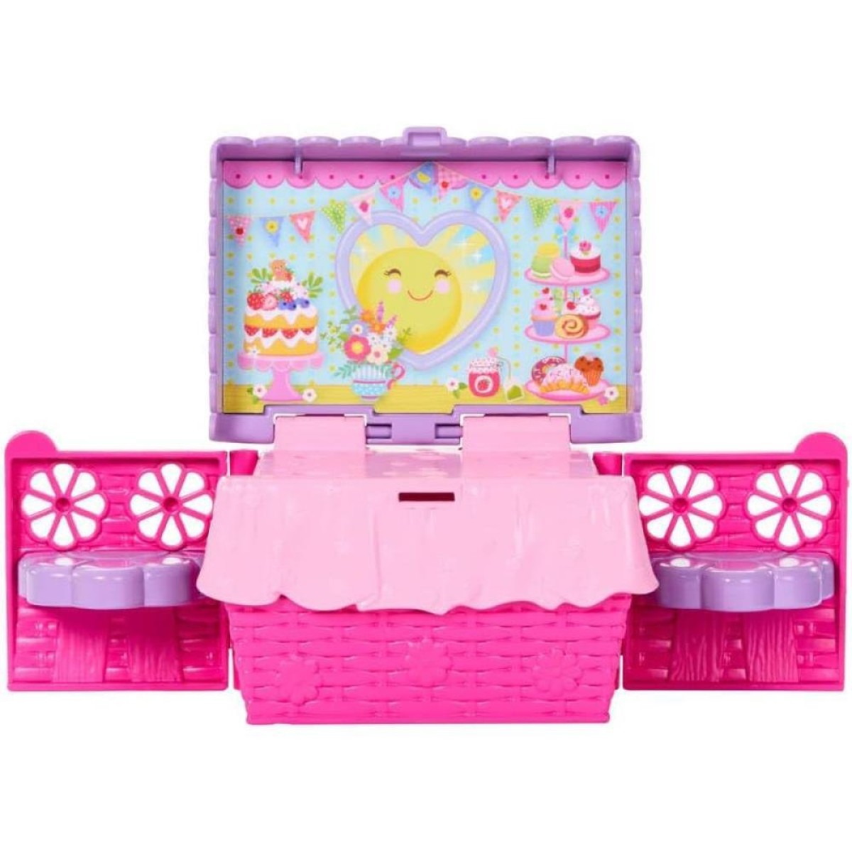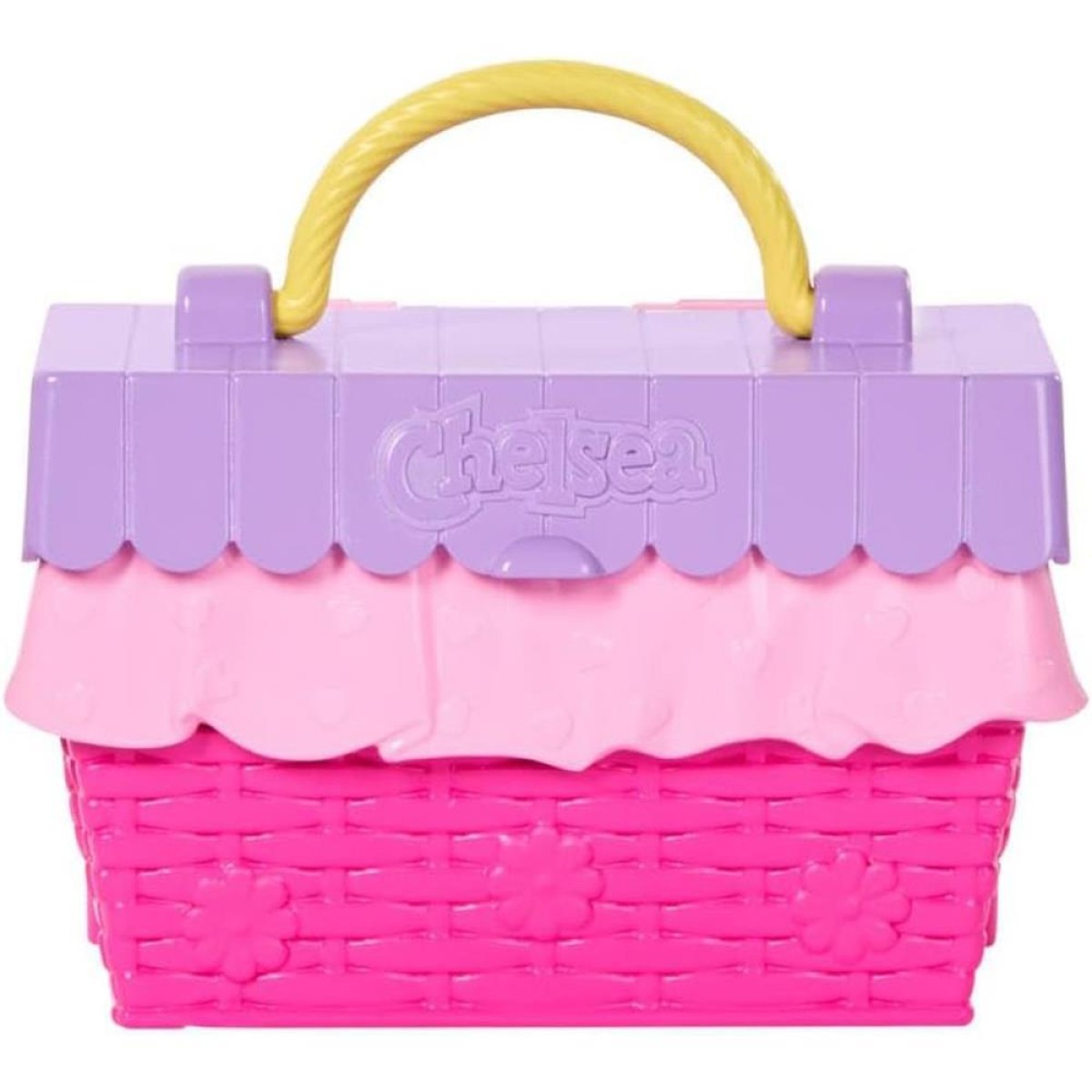 Inclui a boneca Chelsea com saia removivel, 1 cesta de piquenique que se abre revelando uma mesa e cadeiras, 1 ursinho de pelucia, 1 tiara, 1 copo, 1 bule, 2 xicaras de cha, 1 prato para biscoitos, 2 muffins, 2 guardanapos e 1 suporte de exibicao.