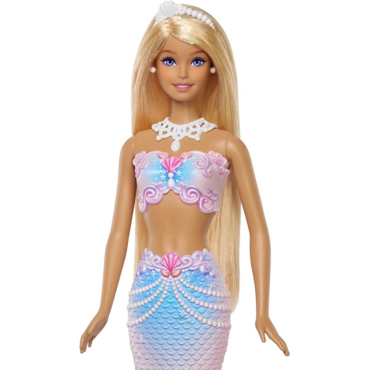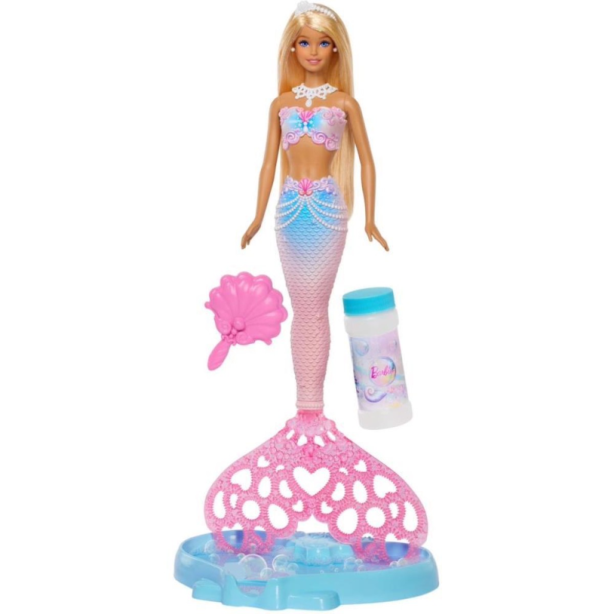 Inclui: 1 boneca sereia Barbie Bubble Sparkle Mermaid com função de bolhas, 1 bandeja em formato de concha, 1 frasco de solução de bolhas (aprox. 60 ml) e 1 escova de cabelo.