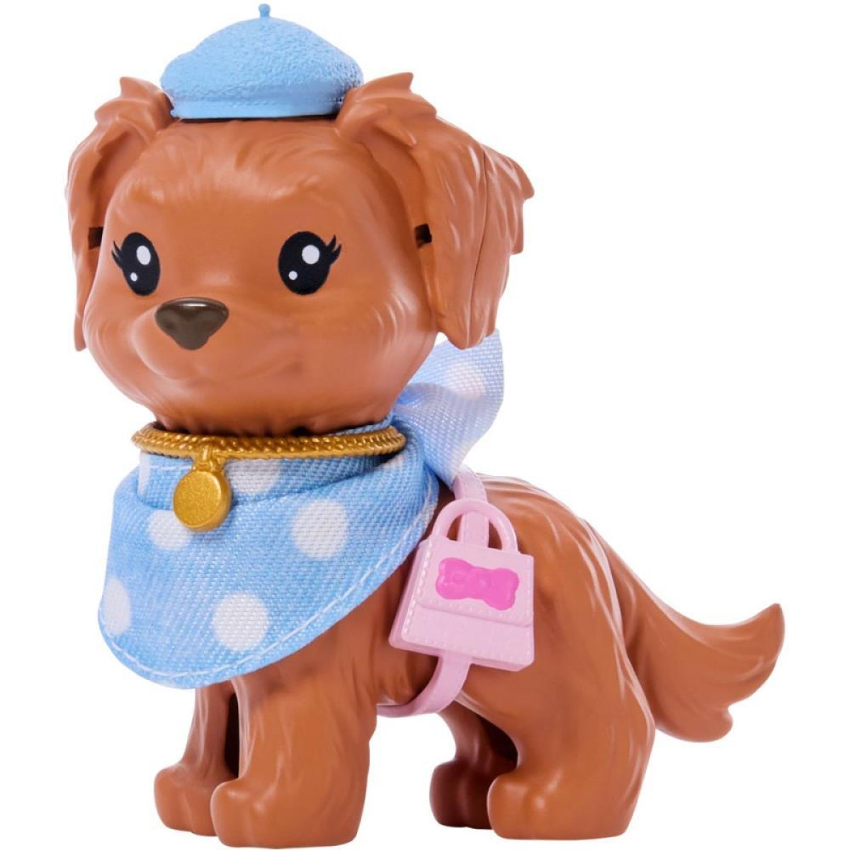 Combinando, a boneca Barbie e seu cachorrinho vêm com looks em bolinhas azuis. Os lacinhos do vestido da Barbie combinam com o laço da bandana do pet!
