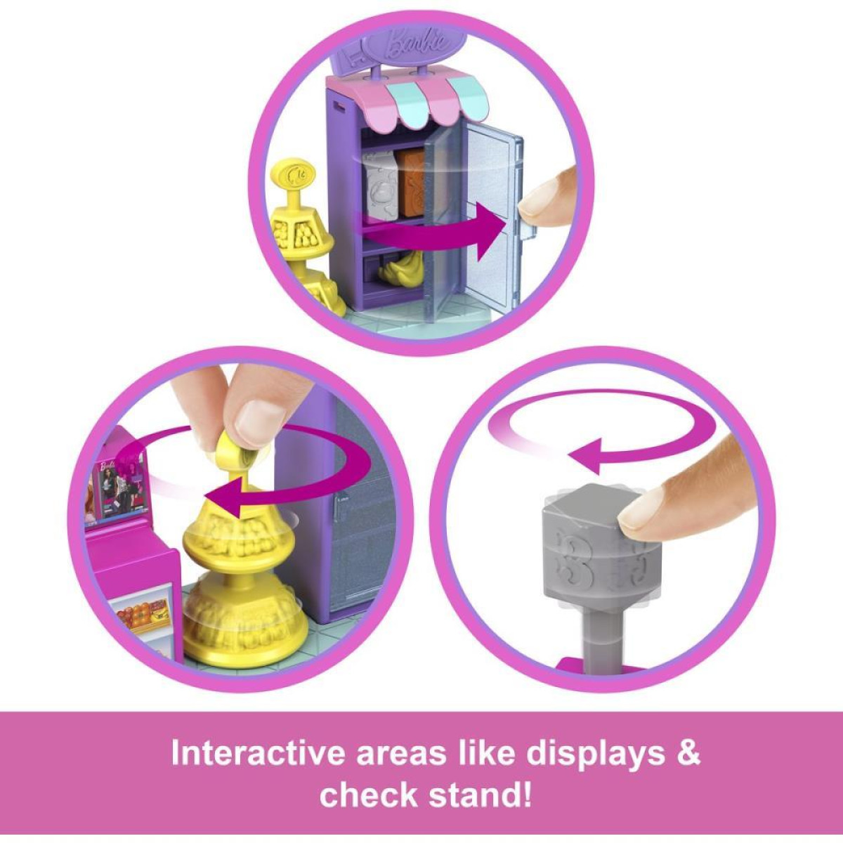 Inclui 1 mini casa de bonecas com piscina, escorregador, animal de estimação e acessório para animal de estimação, 1 Pet Shop, 1 Salão de Beleza, 1 Supermercado, 6 mini bonecas Barbie e 3 surpresas.