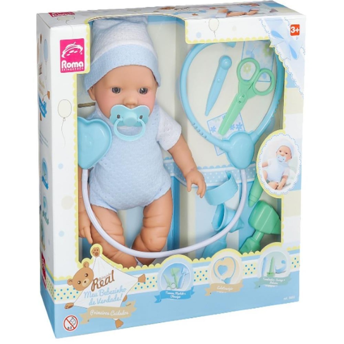 Bebezinho Real 1º Cuidado Azul. Muito fofinho, ele possui o corpinho muito macio com um delicioso cheirinho de bebe e detalhes incriveis para tornar a experiencia das pequenas mamaes ainda mais real e divertida. Usando uma divertida roupinha de ursinho e uma toquinha na cabeca, ele acompanha sua naninha e uma chupeta no formato do ursinho para aumentar a realidade e levar ainda mais alegria durante a brincadeira, exibindo delicados tons de azul. Uma companhia perfeita para que as pequenas possam cuidar de seu novo amiguinho com muita descontracao, afeto e aprendizado. Composicao: Material: Vinil.