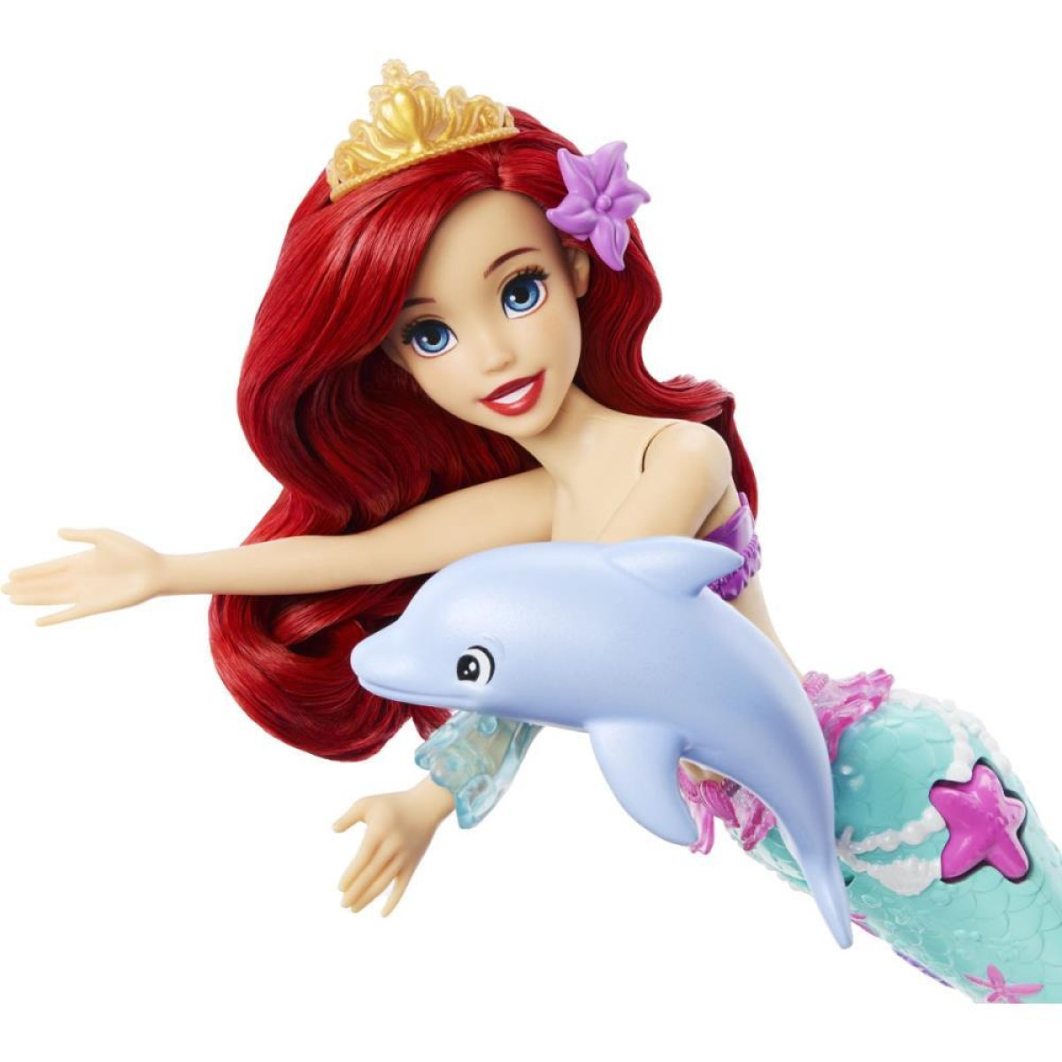 A boneca sereia Disney Princesa Ariel com Golfinho e Sebastian celebra a vida no fundo do mar! Inspirada na personagem animada do filme A Pequena Sereia da Disney, a boneca Ariel pode "nadar" com suas amigas. Basta apertar os quadris da boneca para que sua cauda de sereia se mova para cima e para baixo, como se ela estivesse realmente nadando! Dois adoráveis amigos animais - Sebastian, o caranguejo, e um golfinho que também pode esguichar água - podem se prender ao braço dela e se revezar em aventuras de natação pelo mar. A boneca não pode ficar em pé sozinha. As cores e as decorações podem variar. Qualquer interação com água deve ser feita sob a supervisão de pais ou responsáveis.