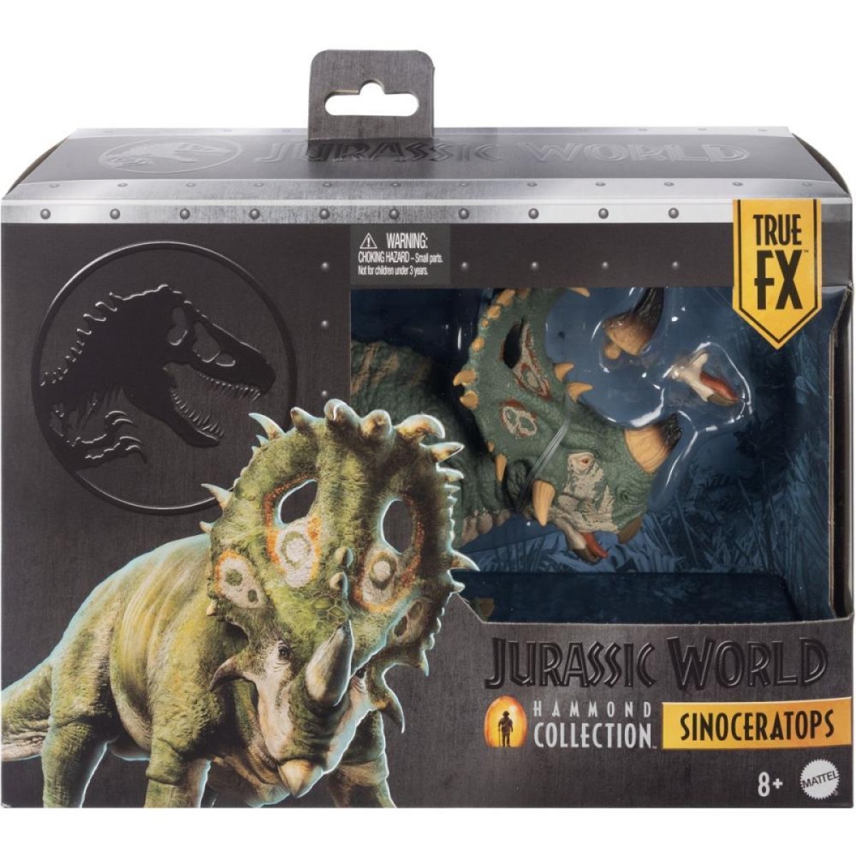 A Colecao Hammond de Jurassic World criou um novo padrao para figuras de acao colecionaveis, com articulacao de luxo e detalhes realistas. Este Sinoceratops, fiel ao filme, e inspirado na memoravel cena da lava em Jurassic World: Reino Ameacado. Representando a especie de grande porte, esta figura de 30 cm vem com chifres intercambiaveis. Um chifre esta quebrado e o outro intacto. Tambem inclui uma mandibula inferior intercambiavel para posicionar a boca aberta ou fechada de forma realista. Os recursos de luxo incluem olhos realistas, cauda flexivel e 14 pontos de articulacao. Este Sinoceratops sera um item indispensavel para colecionadores a partir de 8 anos de idade. As cores e decoracoes podem variar.