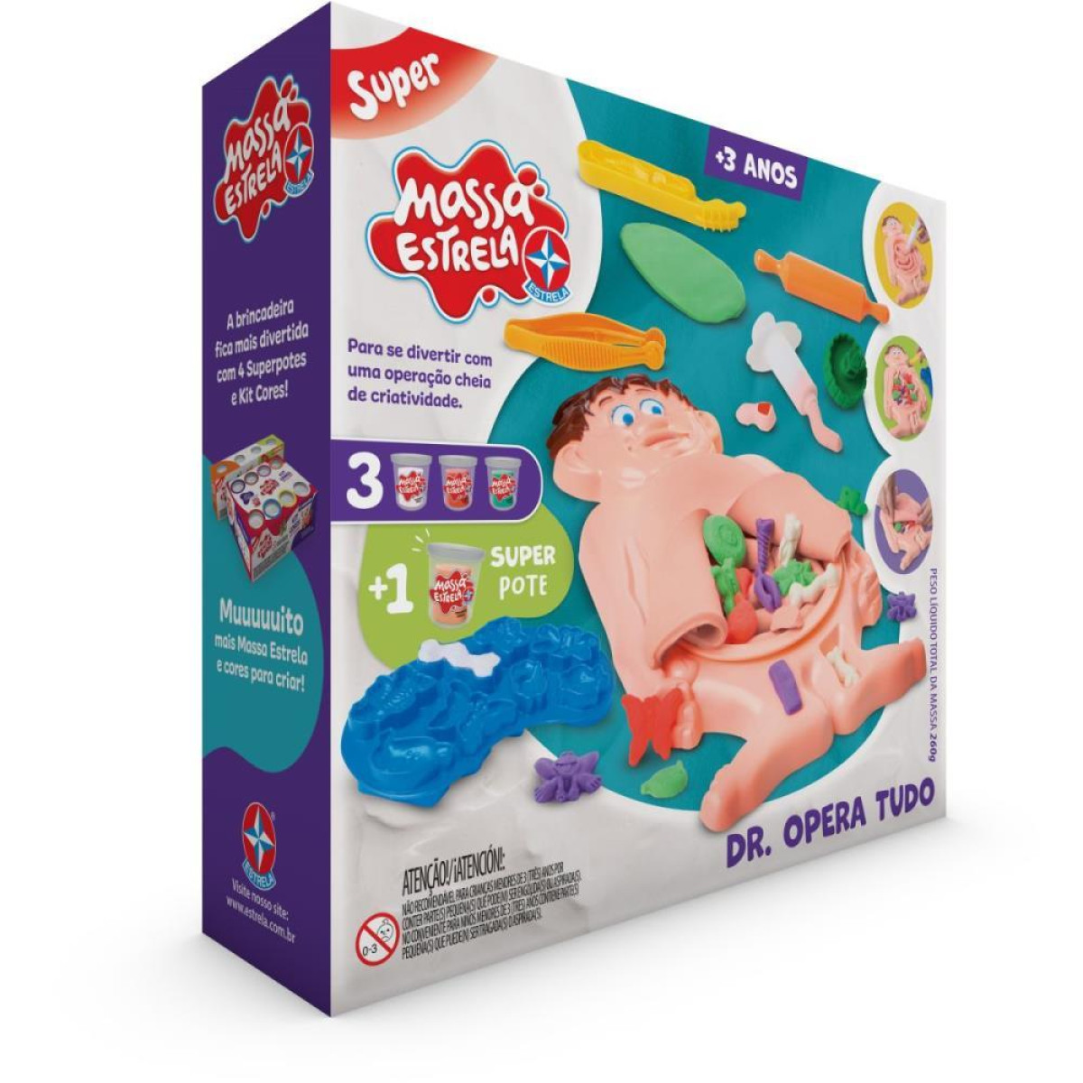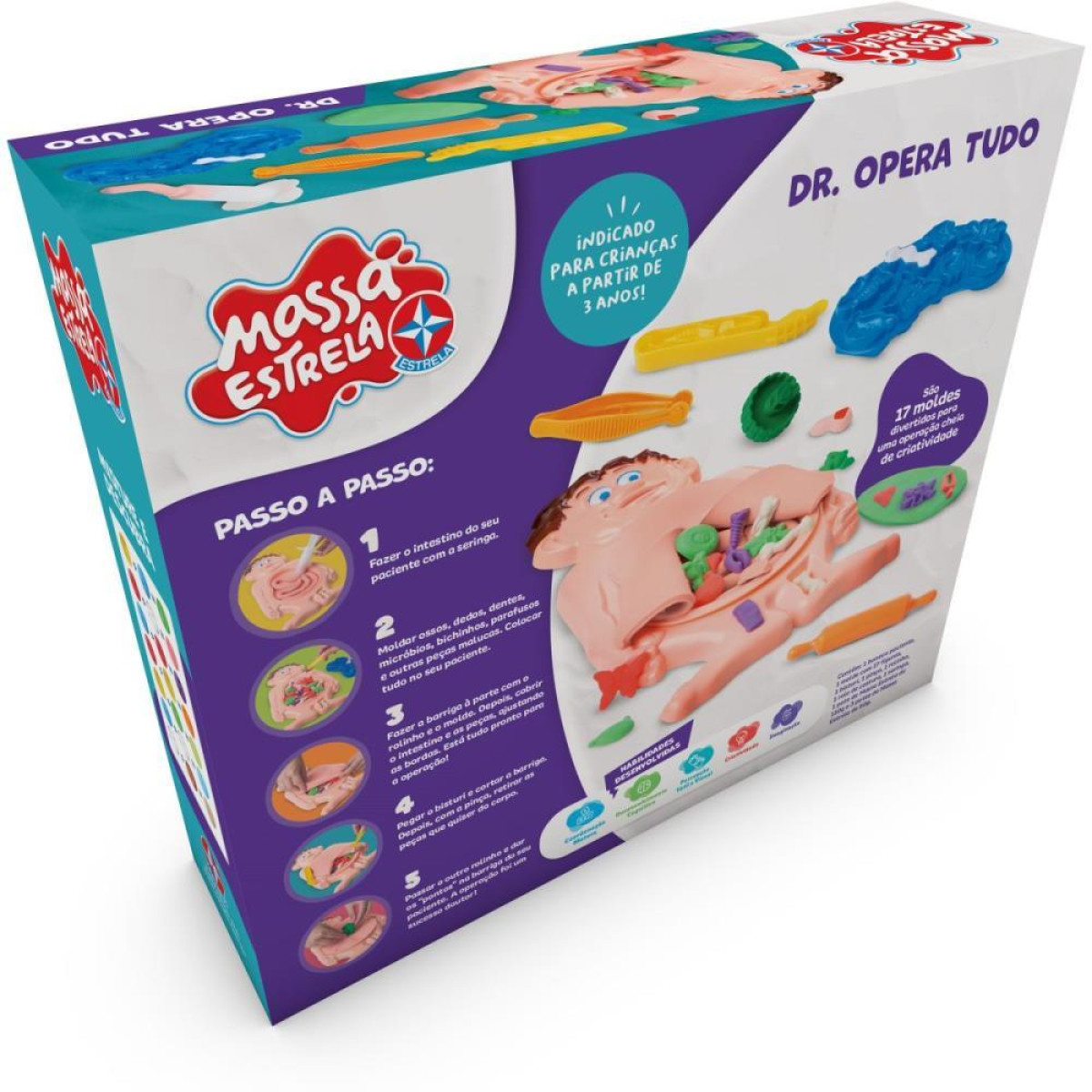 "Com Dr. Opera Tudo Massa Estrela voce pode se divertir com uma operacao cheia de criatividade e tudo o que a imaginacao puder criar! Faca o intestino com a seringa, molde ossos, dedos, dentes, microbios e outras pecas malucas! Sao 17 moldes divertidos para uma cirurgia cheia de criatividade! Ao final, a operacao foi um sucesso doutor!