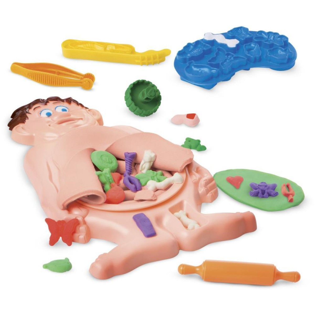 O kit vem com 1 boneco paciente, 1 molde com 17 figuras, 1 bisturi, 1 pinca, 1 rolinho de costura, 1 seringa, 1 pote de Super Massa Estrela de 110g e 3 potes de 50g."
