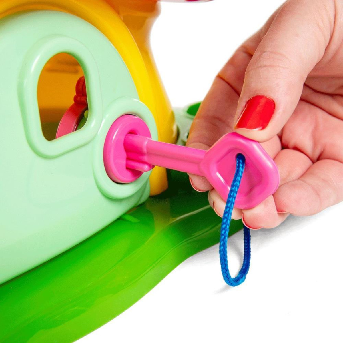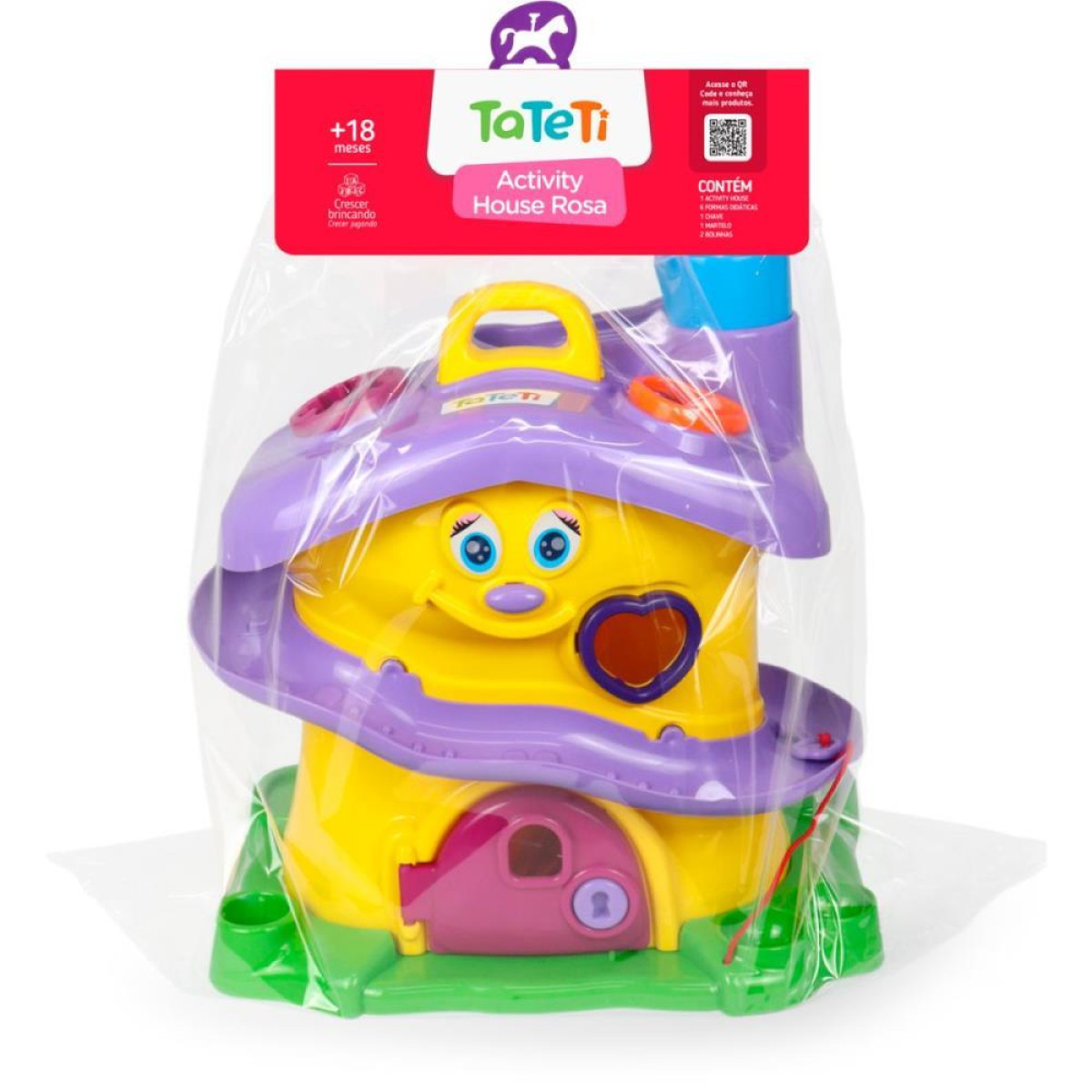 A Activity House Rosa vem com formas coloridas para encaixar. Quando terminar, e so abrir a portinha com chave e pegar as pecas de volta. A brincadeira fica mais divertida com a bolinha que entra pela chamine e cai pelo toboga em volta da casa. O brinquedo ainda vem com um martelinho para impulsionar a bolinha.