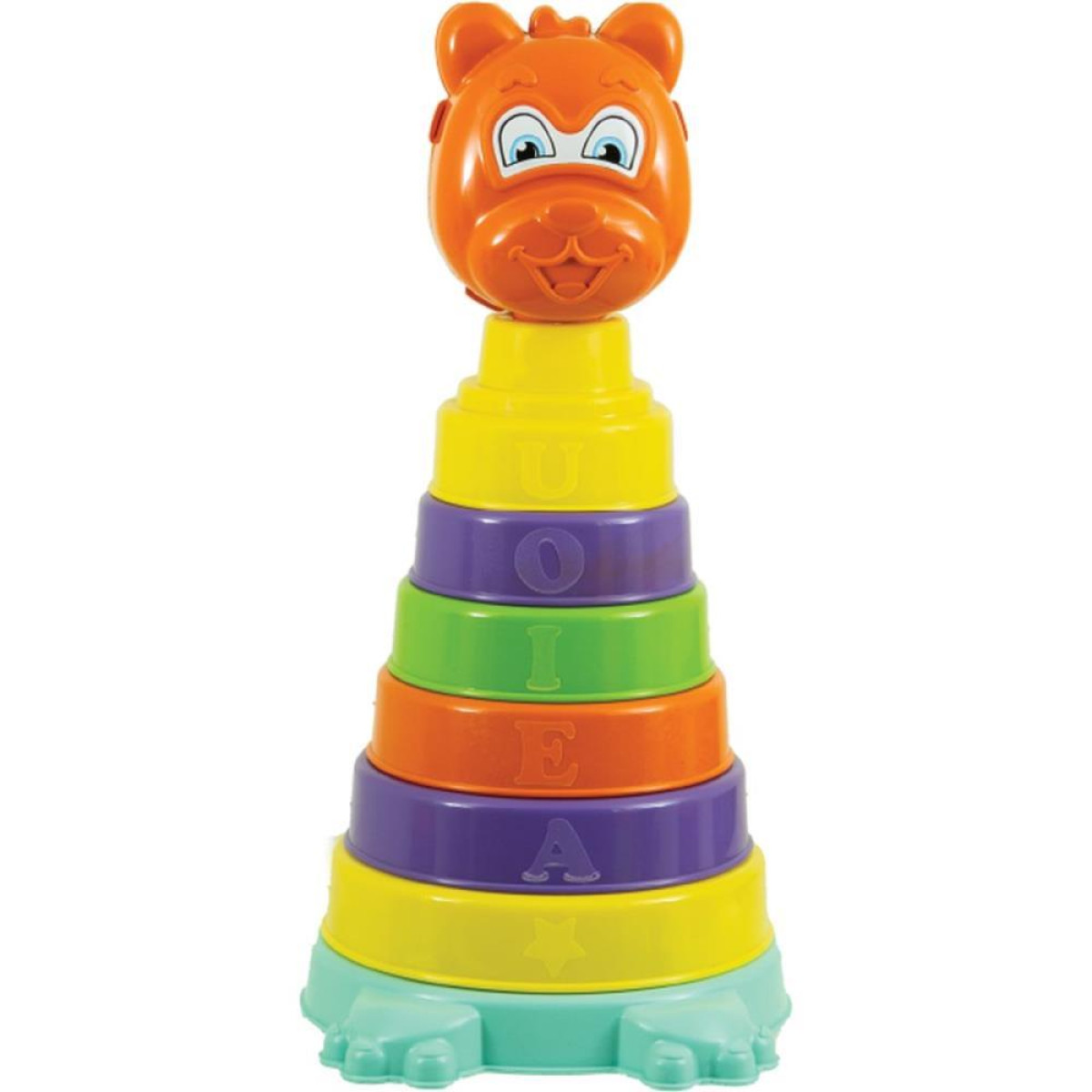 01 ursinho com 06 aneis coloridos para empilhar, com numeracao e letras; 01 torre com 04 pecas coloridas para encaixar; 01 bola com 06 formas geometricas diferentes para encaixar.