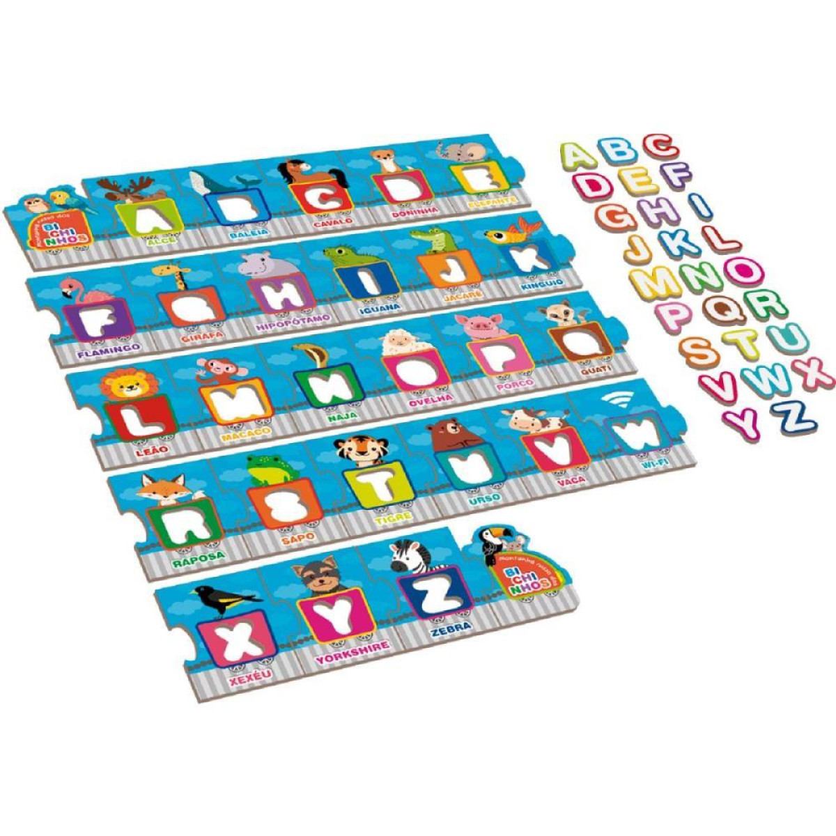 Alfabeto Montanha Russa dos Bichinhos traz 156 pecas em madeira que combinam aprendizado do alfabeto com diversao visual: cada letra tem seu bichinho ilustrado em formato de montanha-russa, estimulando reconhecimento das letras e coordenacao motora num jogo ludico.