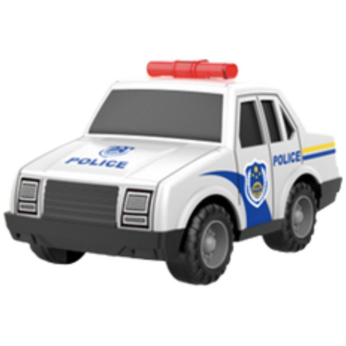 Display de carrinhos de policia com funcao pull-back puxe e solte para andar, nas cores branco e azul, contendo 4 modelos: uma viatura e tres caminhoezinhos.