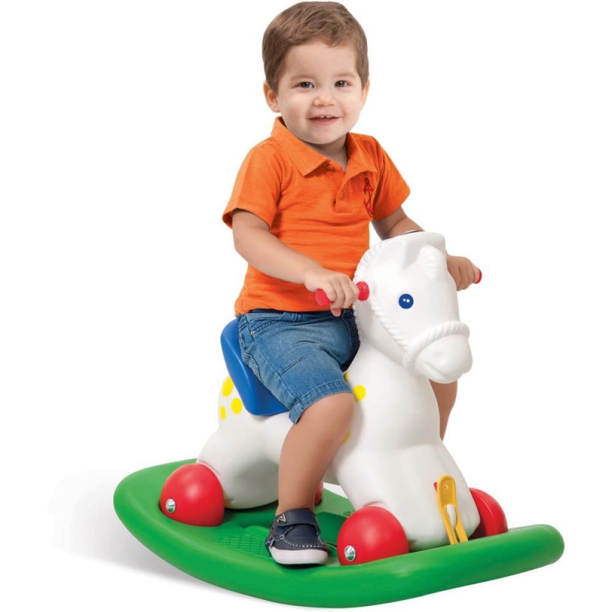 O classico cavalinho com duas formas de brincar: balancando ou treinando os primeiros passinhos. FUNCAO BALANCO: Por meio da base, oferece um balanco seguro e confortavel.