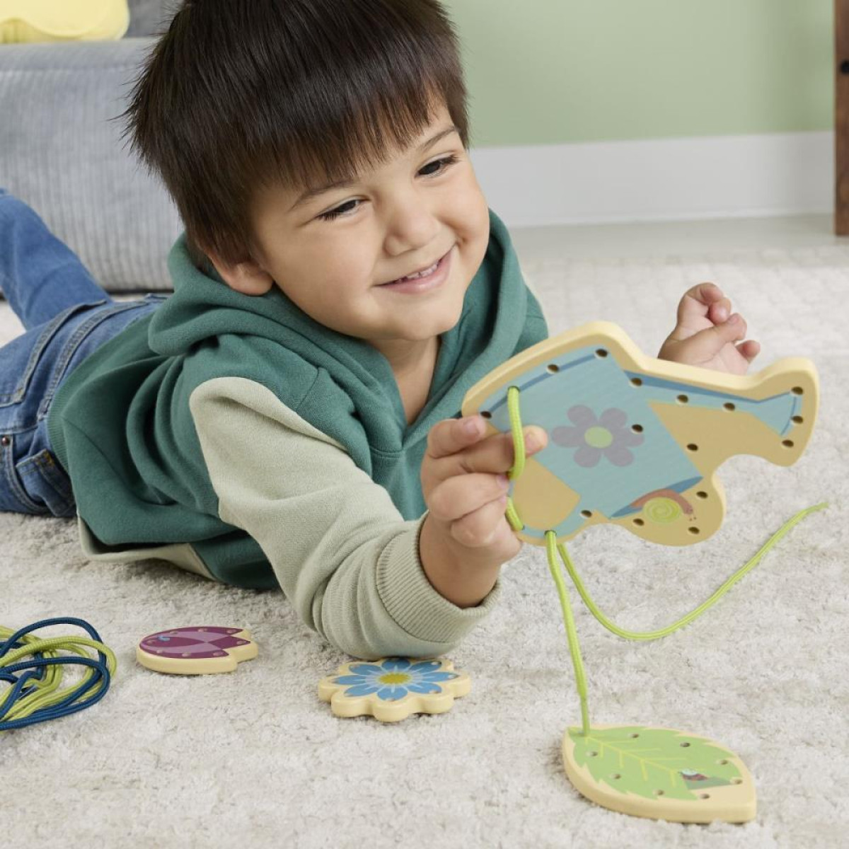 Os meninos podem desenvolver suas habilidades motoras finas por meio de atividades criativas de amarrar e traçar com o conjunto Wooden Lacing Garden da Fisher-Price. Os meninos podem passar os cordões coloridos pelos cartões de madeira com dupla face e "costurá-los" juntos para criar seu próprio jardim. Fabricado com madeira proveniente de fontes certificadas pelo FSC® (FSC-N004566) e decorado com tinta não tóxica à base de água, este conjunto temático de jardim incentiva a criatividade enquanto fortalece a destreza e a coordenação olho-mão. As cores e as decorações podem variar.