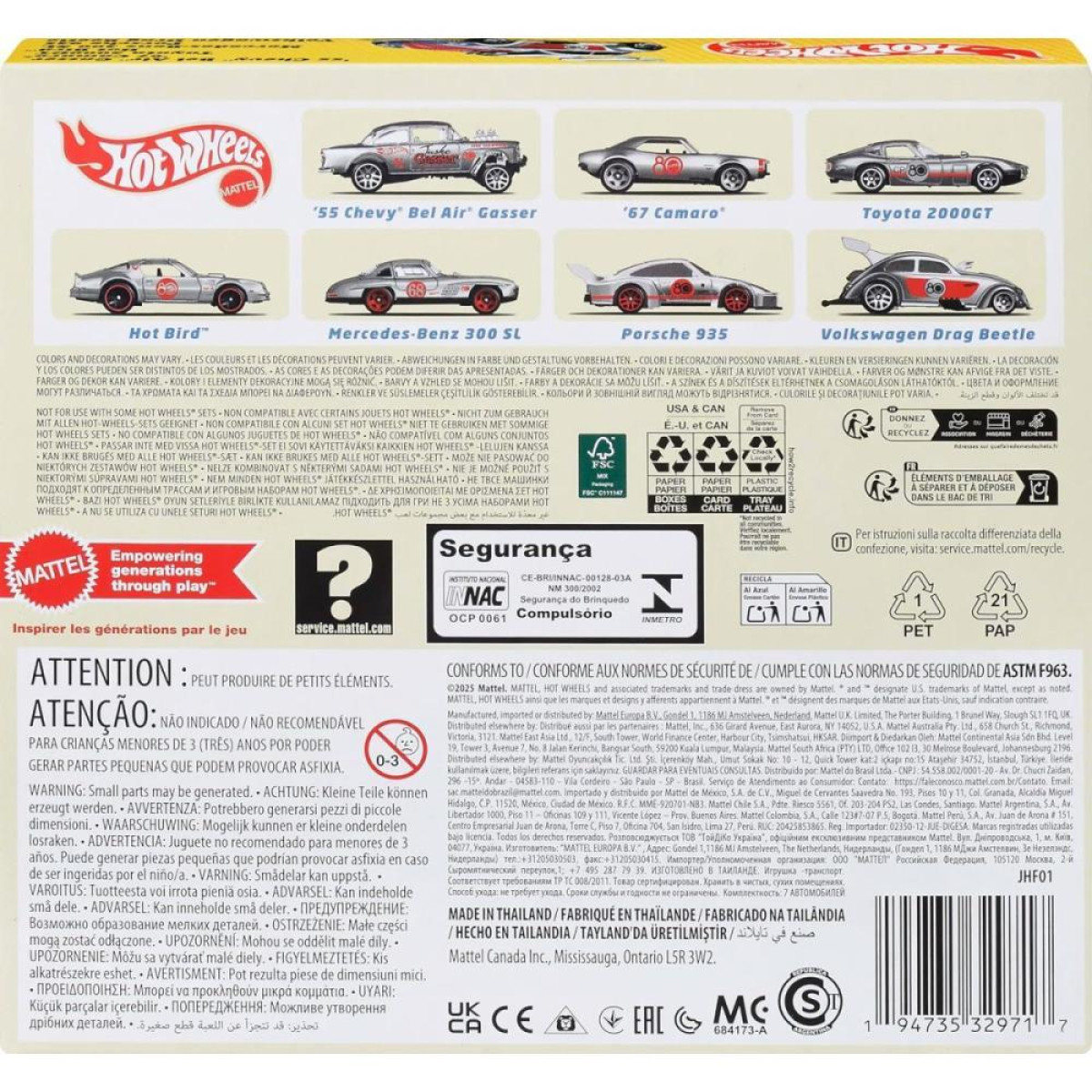 Comemore o 80º aniversário da Mattel com um pacote com 7 carrinhos e caminhões de brinquedo em escala 1:64. O conjunto apresenta peças nostálgicas de veículos americanos, europeus e da JDM anteriores à década de 1970, incluindo um Chevy Bel-Air Gasser 1955 e um Porsche 935. Cada um tem pintura ZAMAC com detalhes em vermelho-rubi para destacar o marco da fabricante de brinquedos, e há dois veículos totalmente em zinco para maior colecionismo. A embalagem do 80º aniversário destaca a ocasião memorável e é perfeita para guardar ou expor os carros. As cores e a decoração podem variar.
