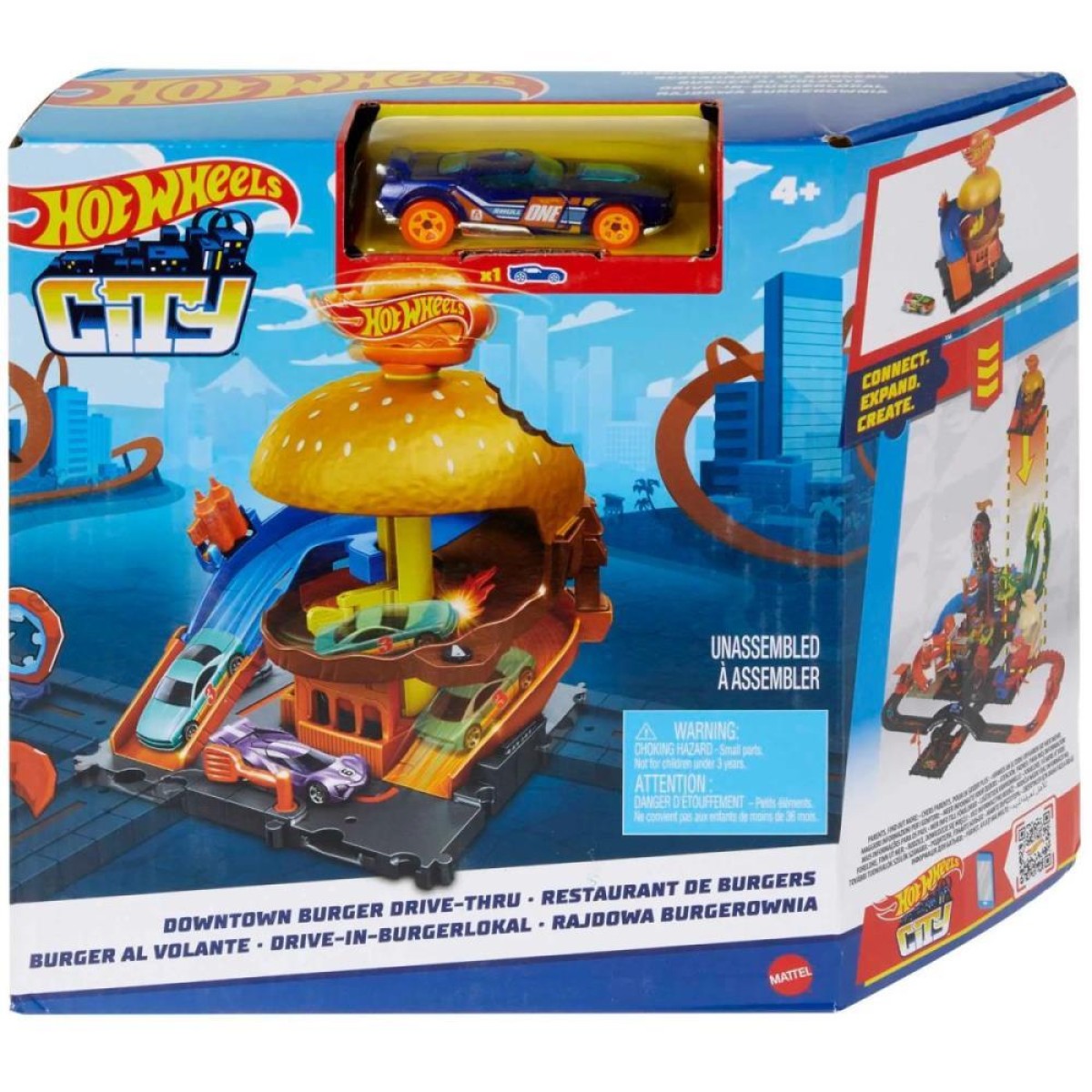 Inclui: 1 kit Hot Wheels City Downtown e 1 carrinho de aprox. 7 cm.