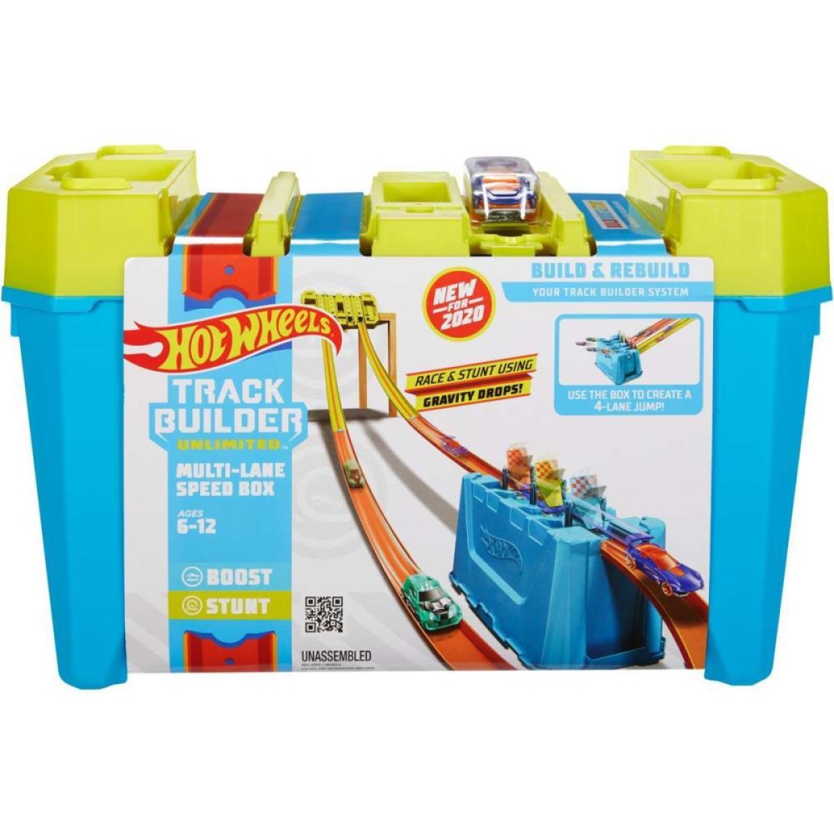 Caixa de pistas com peças que oferecem opções infinitas para manobras radicais. A radical ação de loop é ainda mais irada ao conectar a pista na tampa, em 8 lugares. A parte inferior possui dois baldes acoplados, além de um local para conectar pistas, conjuntos adicionais ou mesmo componentes, de modo a criar ações com ainda mais adrenalina Os componentes são embalados no cesto, facilitando o transporte. A caixa também faz parte da brincadeira, e possui múltiplos pontos de conexão. O conjunto inclui veículo Hot Wheels®, pista laranja, lançadores e conectores.